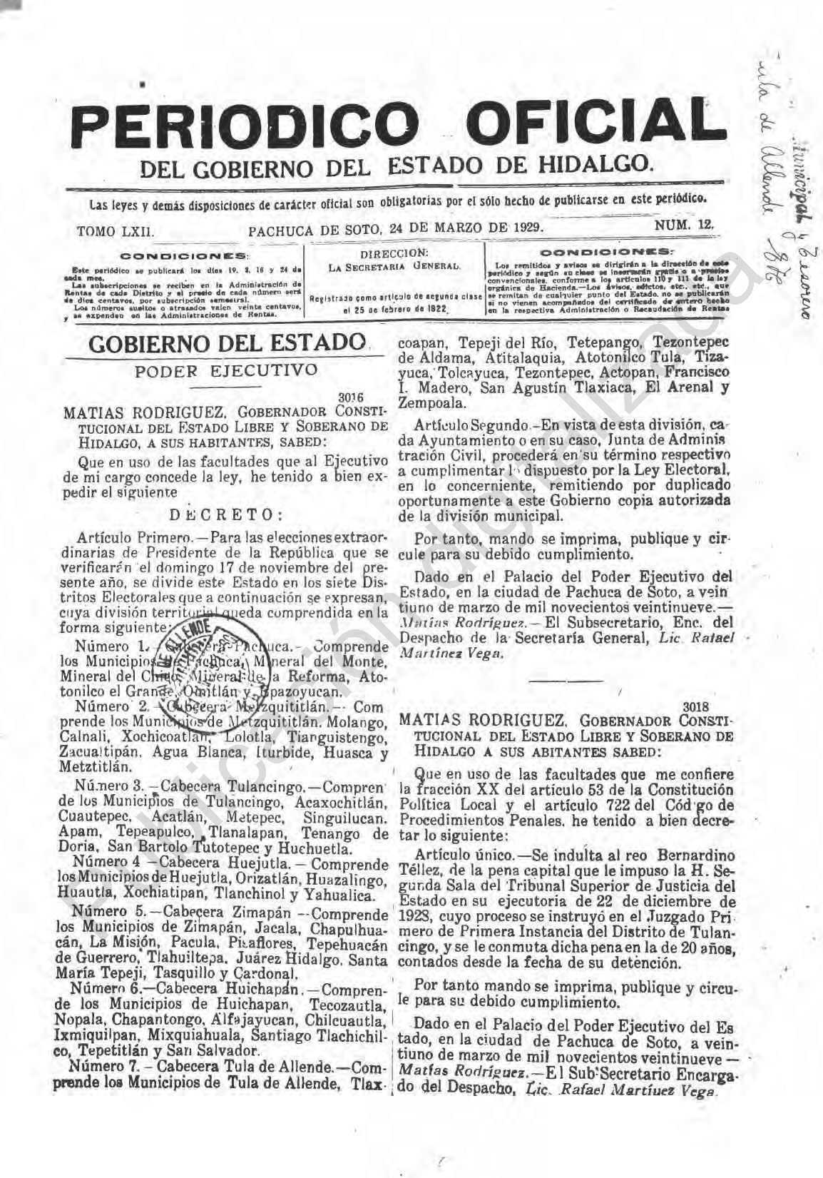 - 3018.- Se indulta al reo Bernardino Tellez, de la Pena Capital que le impuso la H. Segunda Sala del Tribunal Superior de Justicia del Estado en su ejecutoria de 22 de diciembre de 1928, cuyo proceso se instruyo en el Juzgado Primero de Primera Instancia del Distrito de Tulancingo.