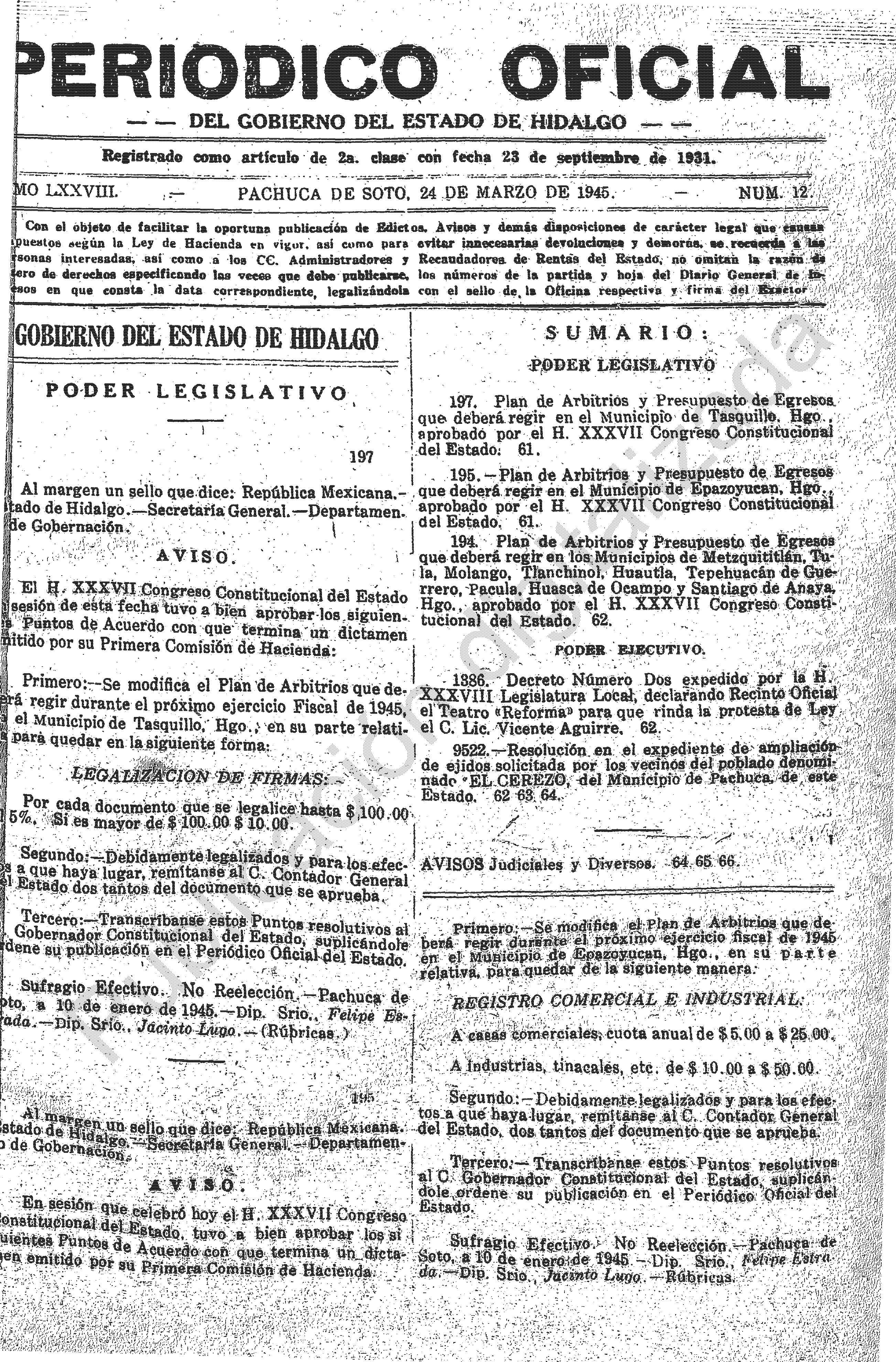 - 197.- Plan de Arbitrios y Presupuesto de Egresos que deberá regir en el Municipio de Tasquillo, Hgo. aprobado por el H. XXXVII Congreso Constitucional del Estado.