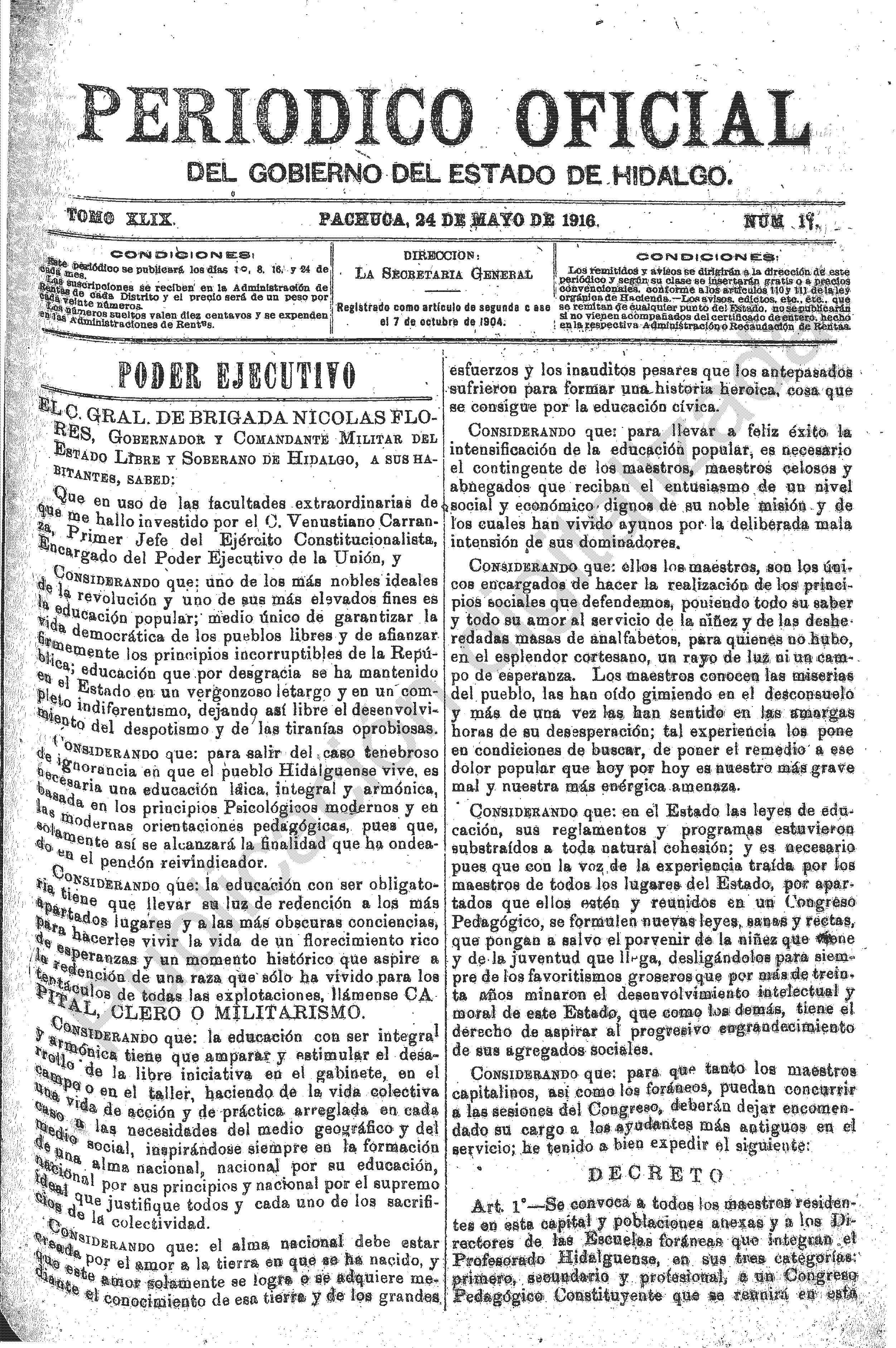 - Poder Ejecutivo, Nicolás Flores, Decreto por el cual Se convoca a Congreso Pedagógico Constituyente, Gobernador Constitucional del Estado Libre y Soberano de Hidalgo.