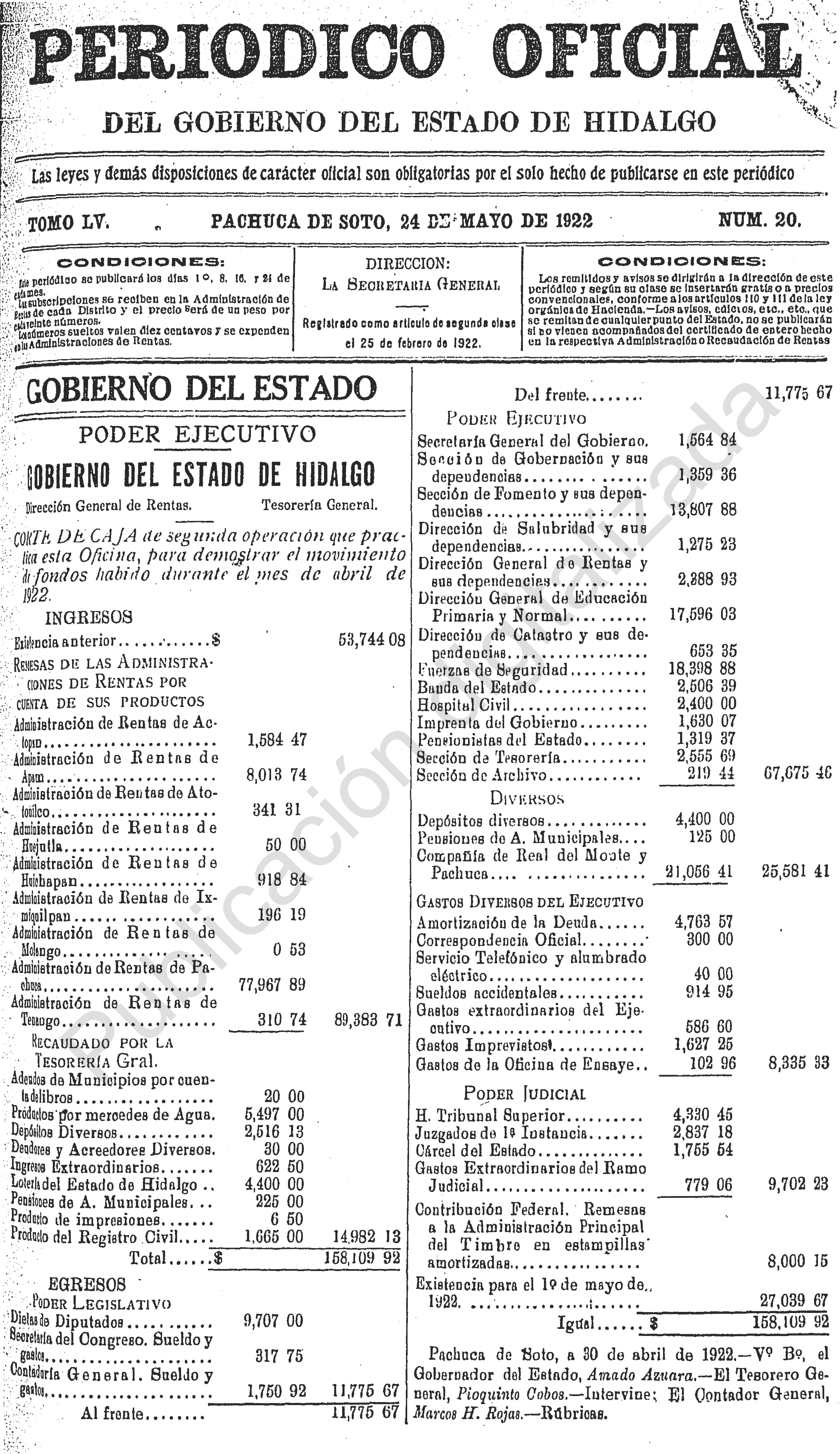 Descargar Periódico Oficial Ordinario 0 del 24 de mayo de 1922El portal web del Periódico Oficial del Estado de hidalgo es el único medio de difusión oficial del Gobierno del Estado de Hidalgo