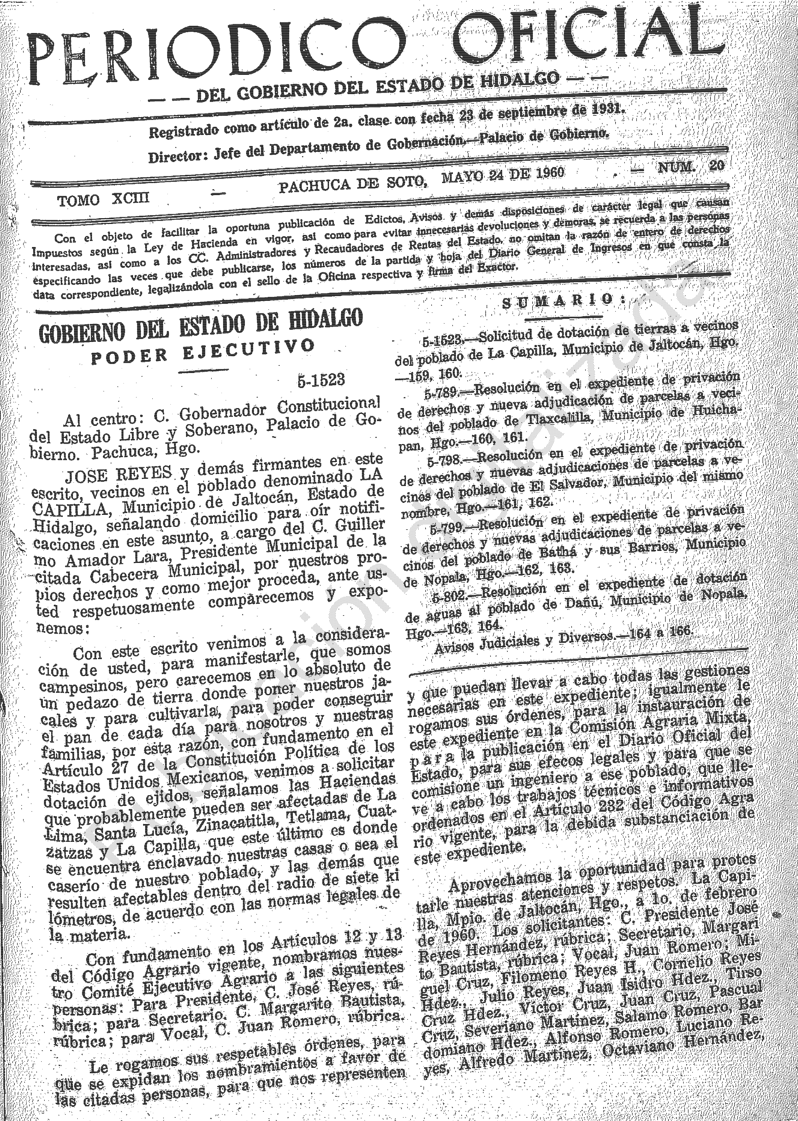 • 5-1523.- Solicitud de dotación de tierras a vecinos del poblado de La Capilla, Municipio de Jaltocán, Hgo.