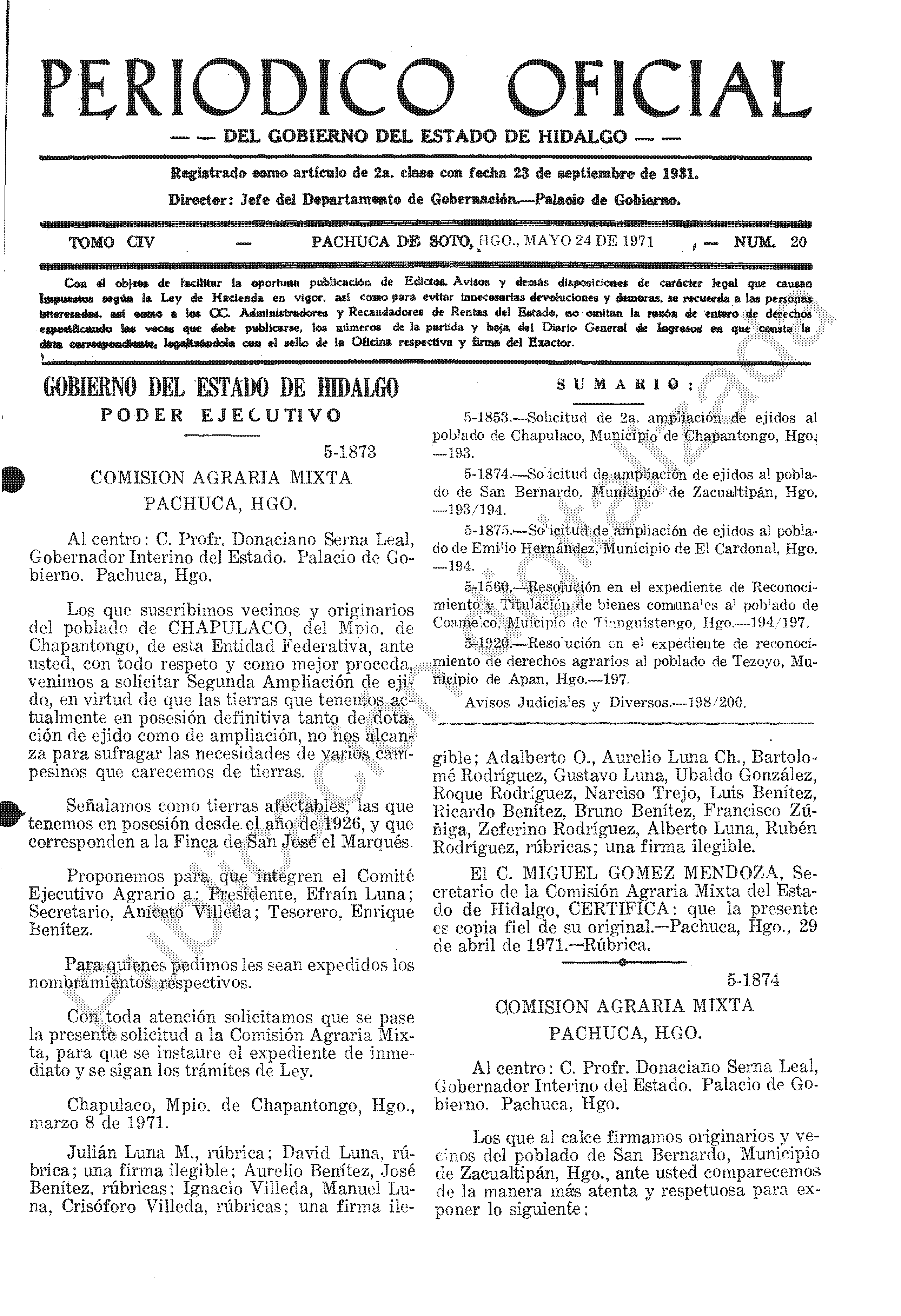 - 5-1874.- Solicitud de ampliación de ejidos al poblado de San Bernardo, Municipio de Zacualtipán, Hgo.