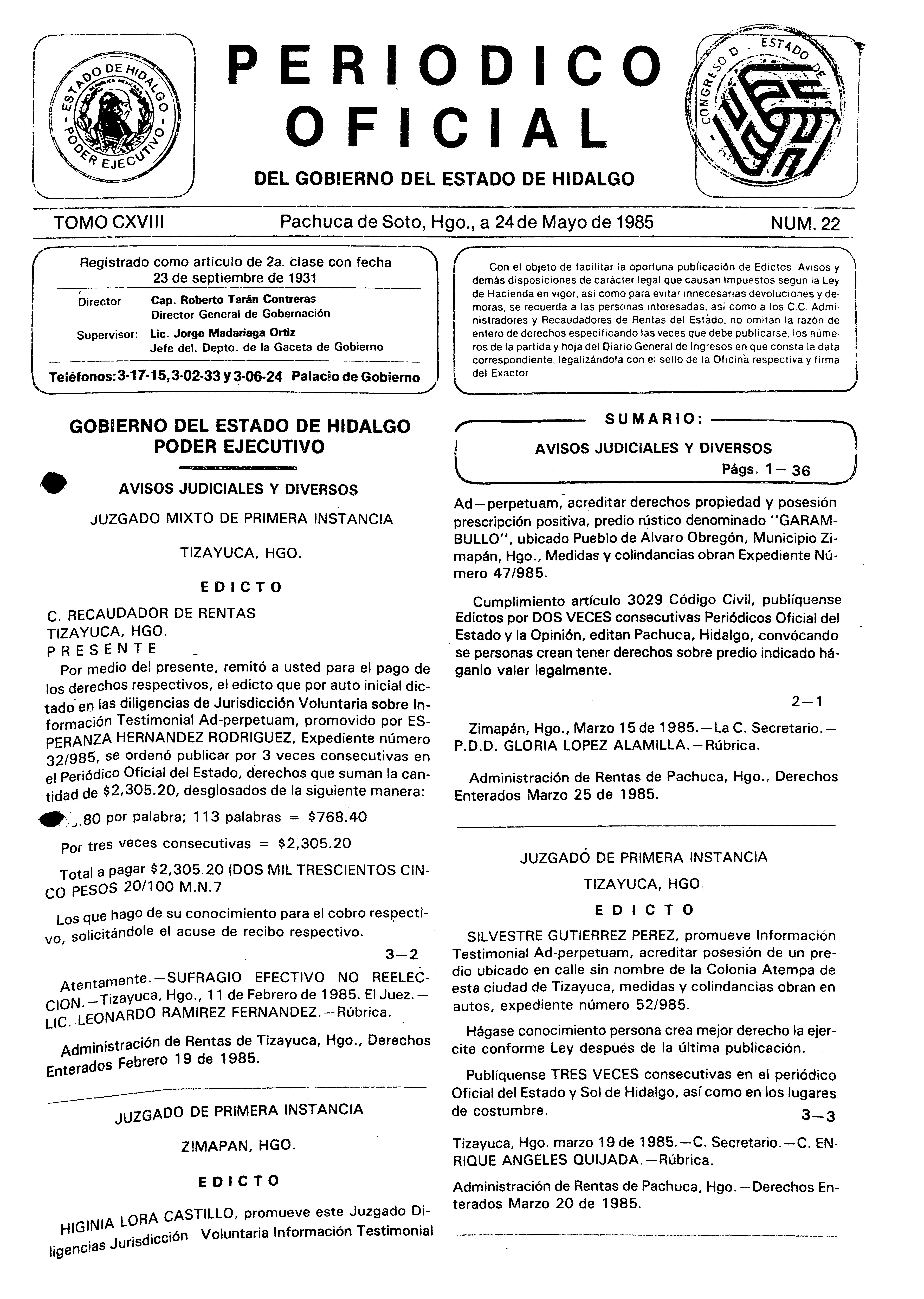 Periódico Oficial Ordinario 0 del 24 de mayo de 1985