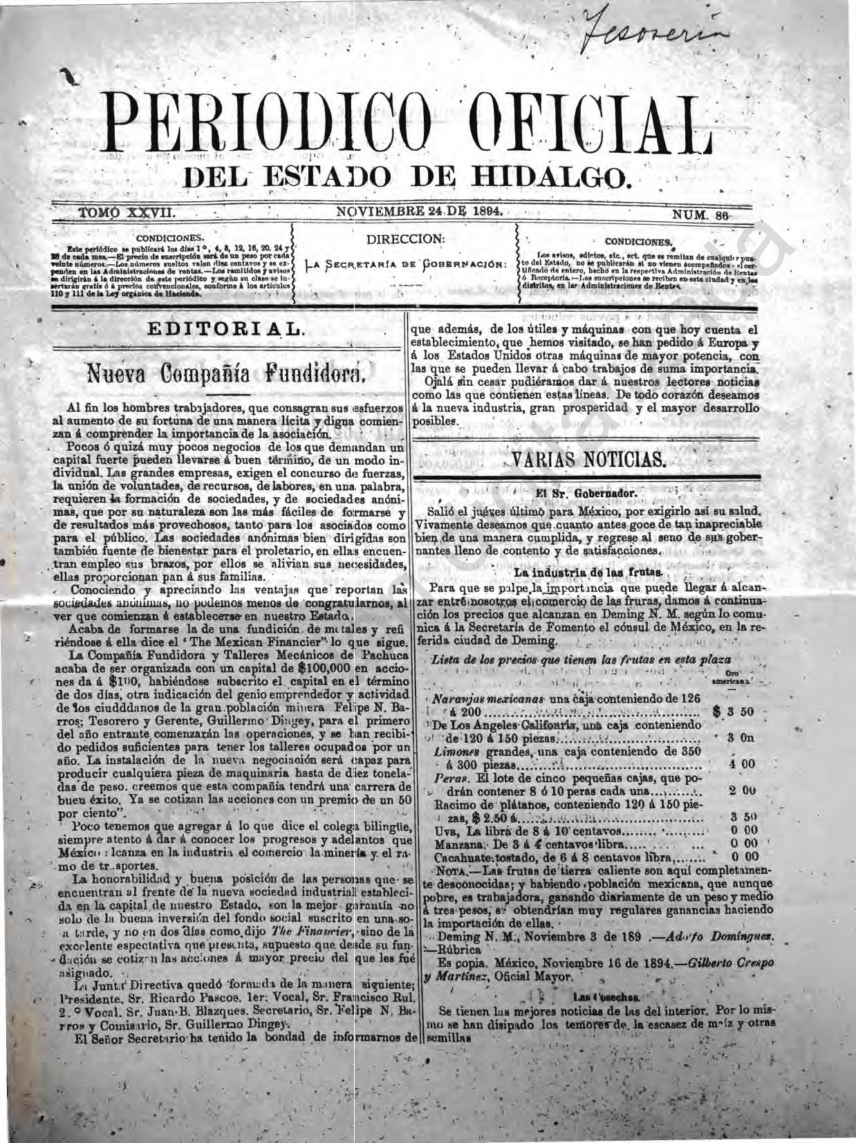 Periódico Oficial Ordinario 0 del 24 de noviembre de 1894
