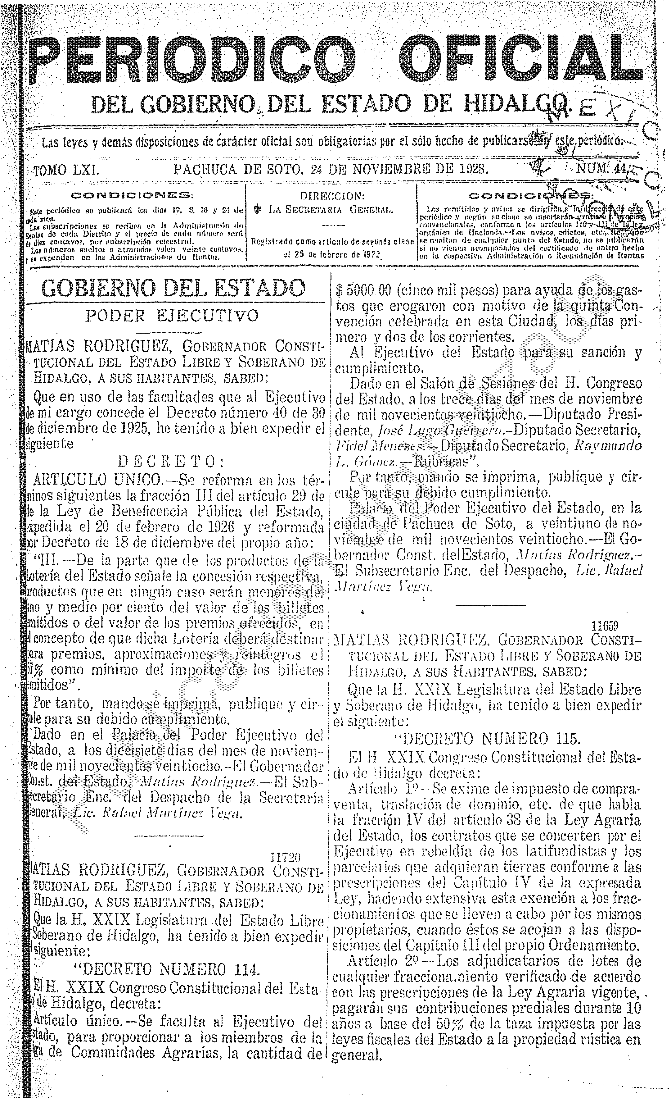 • 11720.-DECRETO NUMERO 114.-Se faculta al Ejecutivo del estado, para proporcionar a los mienbros de la liga de Comunidades Agrarias, la cantidad de $5000.00 (Cinco mil pesos) para ayuda de los gastos que erogaron con motivo de la quinta Convención celebrada en esta cuidad los dias primero y dos de los corrientes.