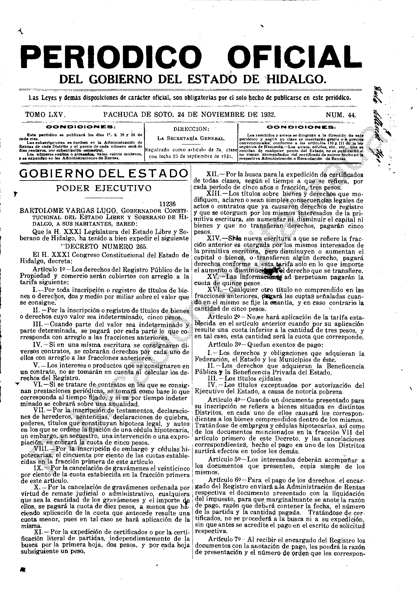 • 11236.- Decreto Número 265, Los derechos del Registro Público de la propiedad y comercio serán cubierto con arreglo a la Tarifa.