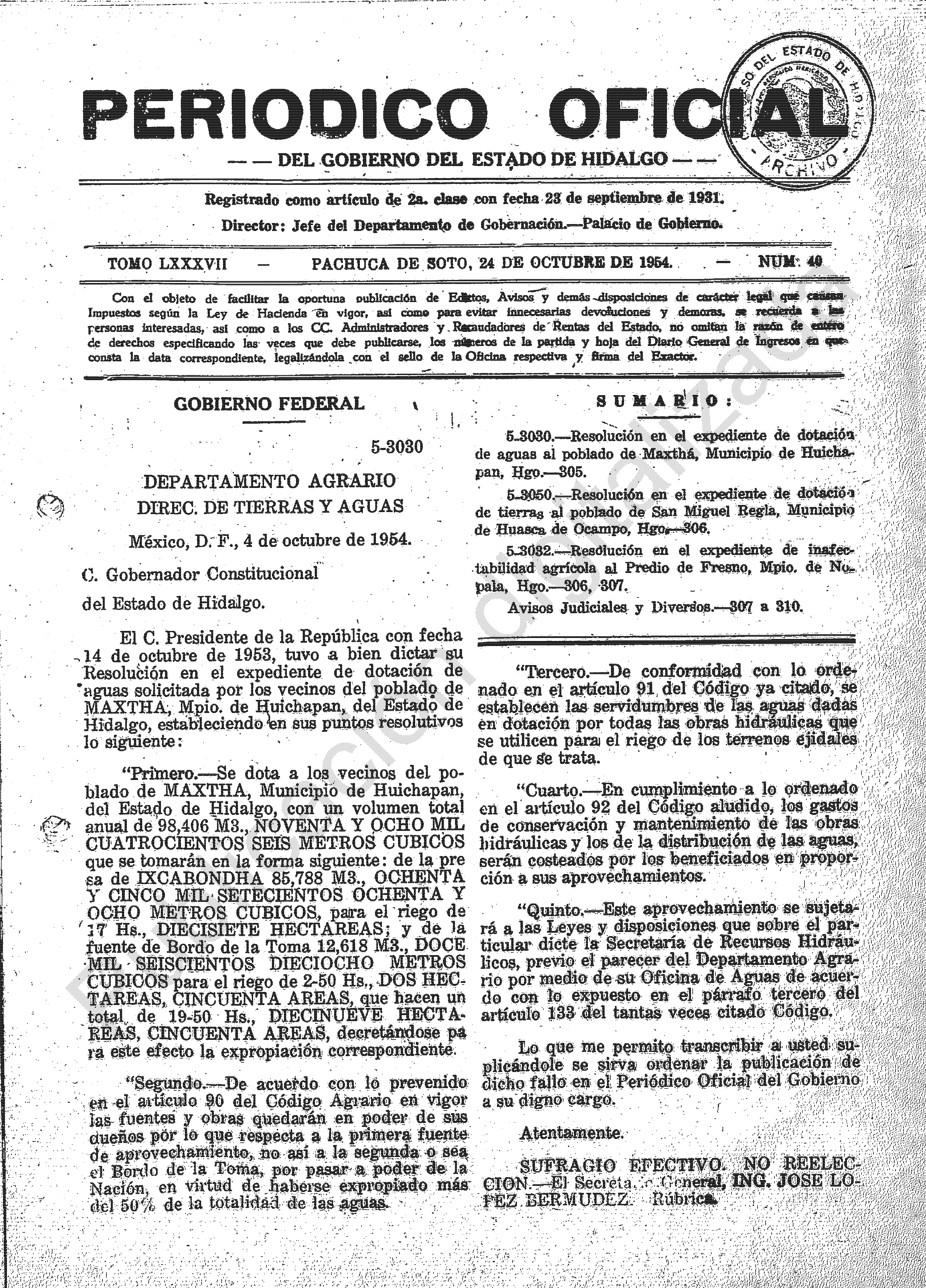 - 5-3030.- Resolución en el expediente de dotación de aguas al poblado de Maxthá, Municipio de Huichapan, Hgo.