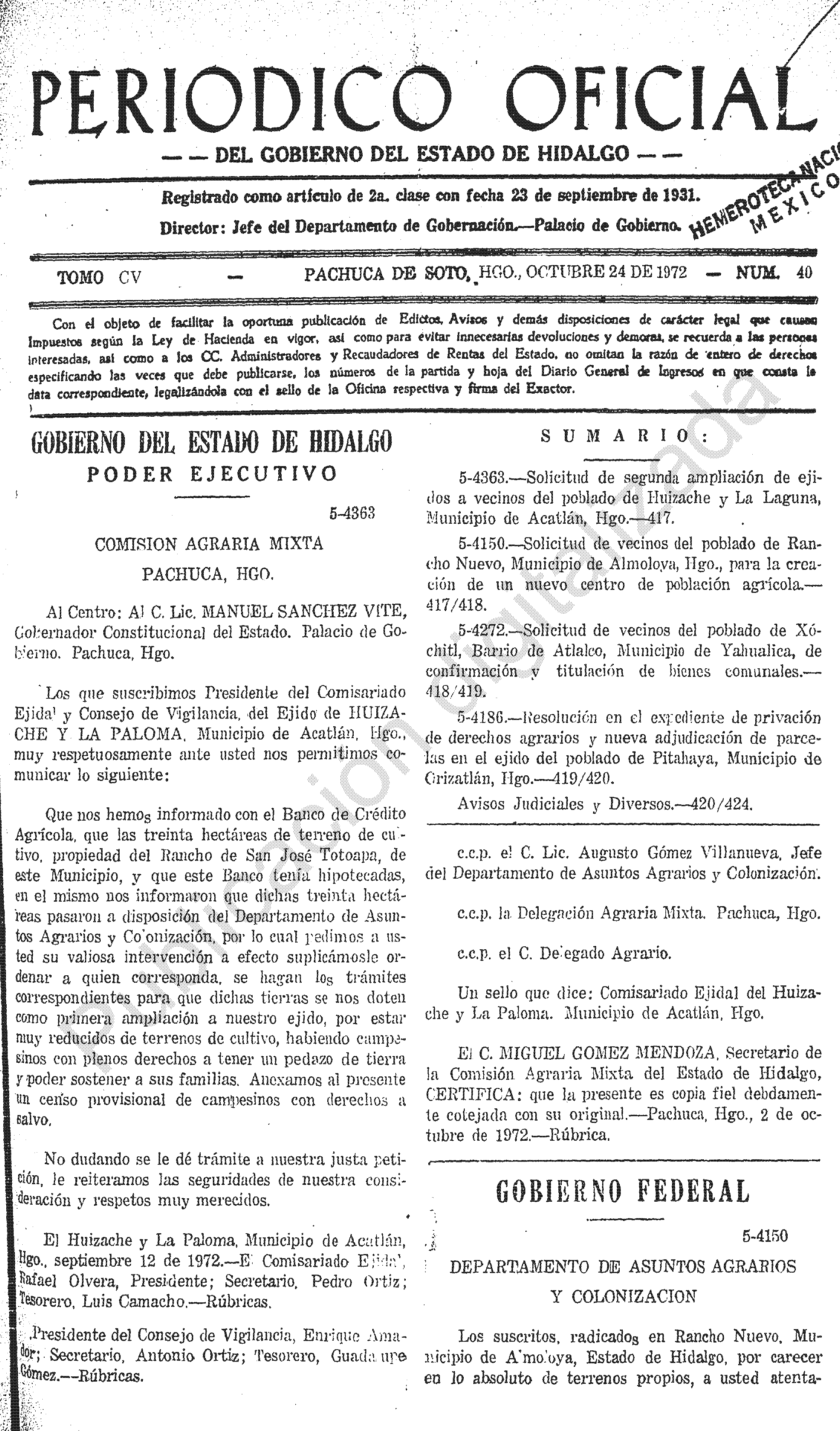 • 5-4150.- Solicitud de vecinos del poblado de Rancho Nuevo, Municipio de Almoloya, Hgo., para la creación de un nuevo centro de población agrícola.