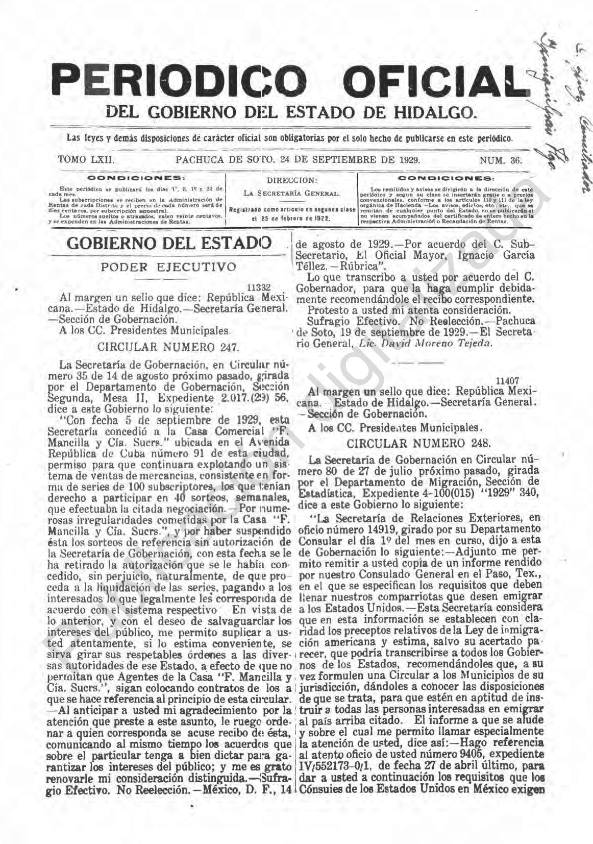- 11332.- CIRCULAR NUMERO 247.-Con fecha 5 de Septiembre de 1929, esta Secretaria concedió a la Casa Comercial “F. Mancilla y Cia. Sucrs”, Ubicada en la avenida Republica de Cuba número 91 de esta Ciudad permiso para que continuara explotando un sistema de ventas de mercancias.