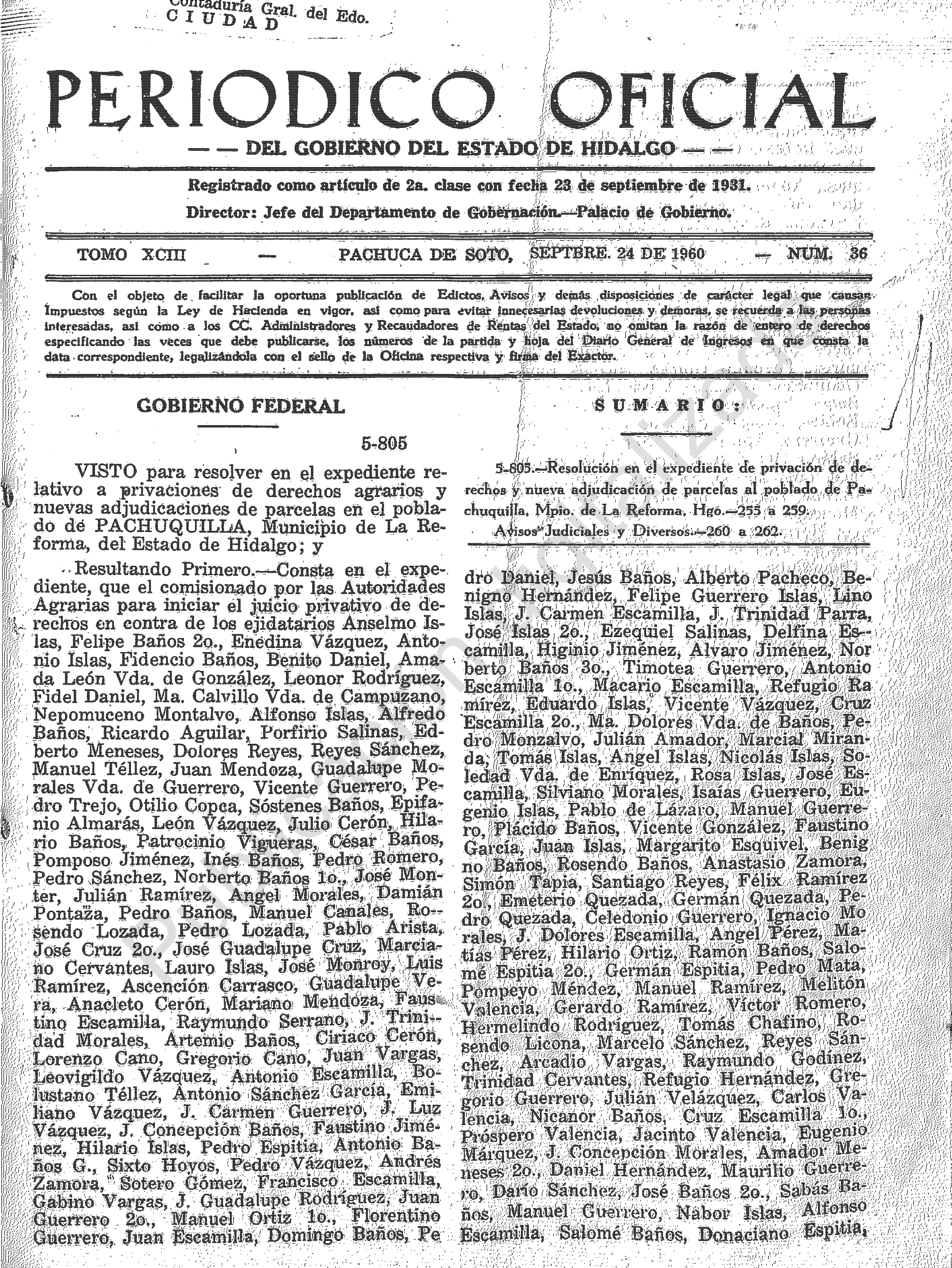 - 5-805.- Resolución en el expediente de privación de derechos y nueva adjudicación de parcelas al poblado de Pachuquilla, Mpio. de La Reforma, Hgo.