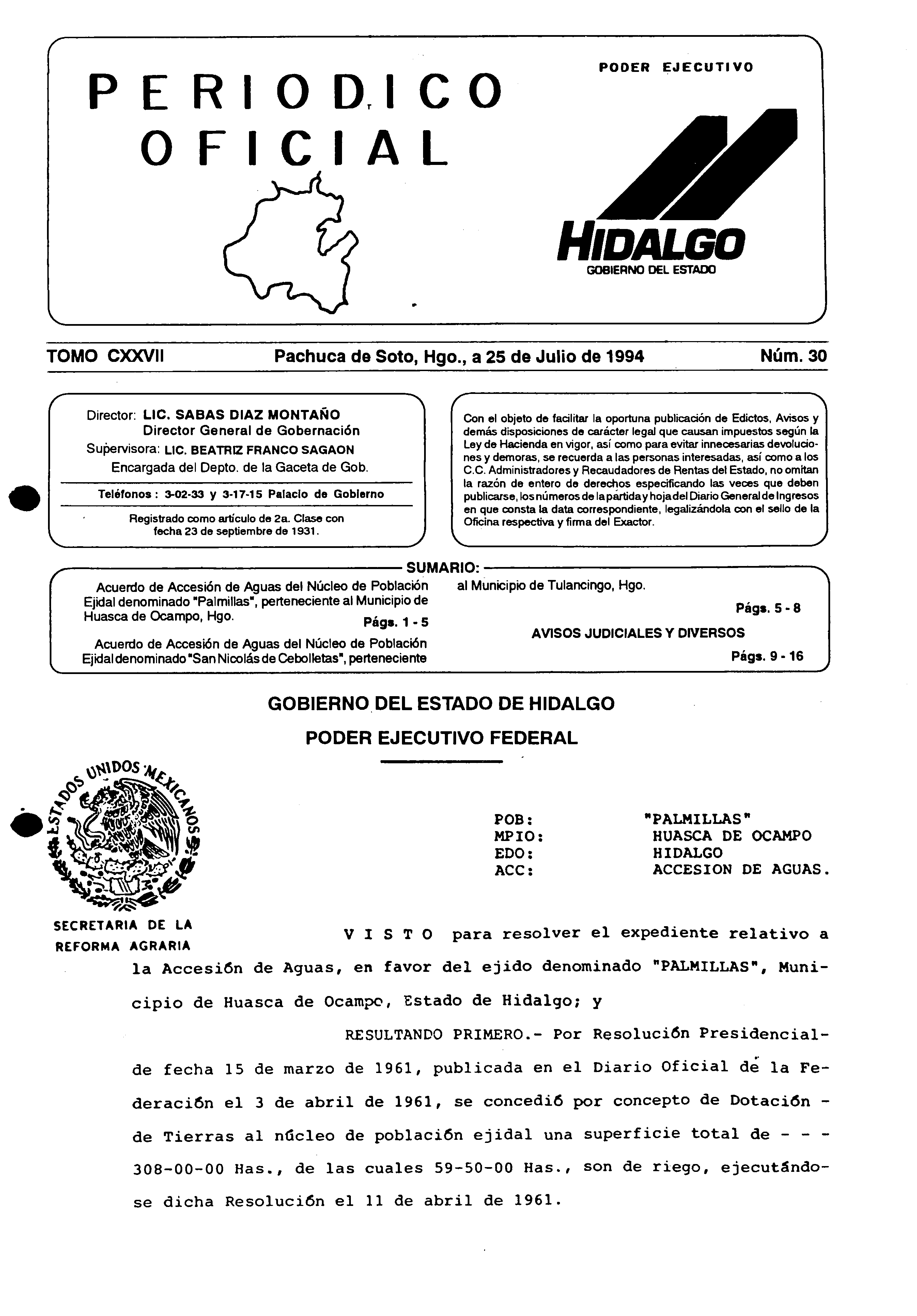 • Acuerdo de Accesión de Aguas del Núcleo de Población Ejidal denominado “Palmillas”, perteneciente al Municipio de Huasca de Ocampo, Hgo.