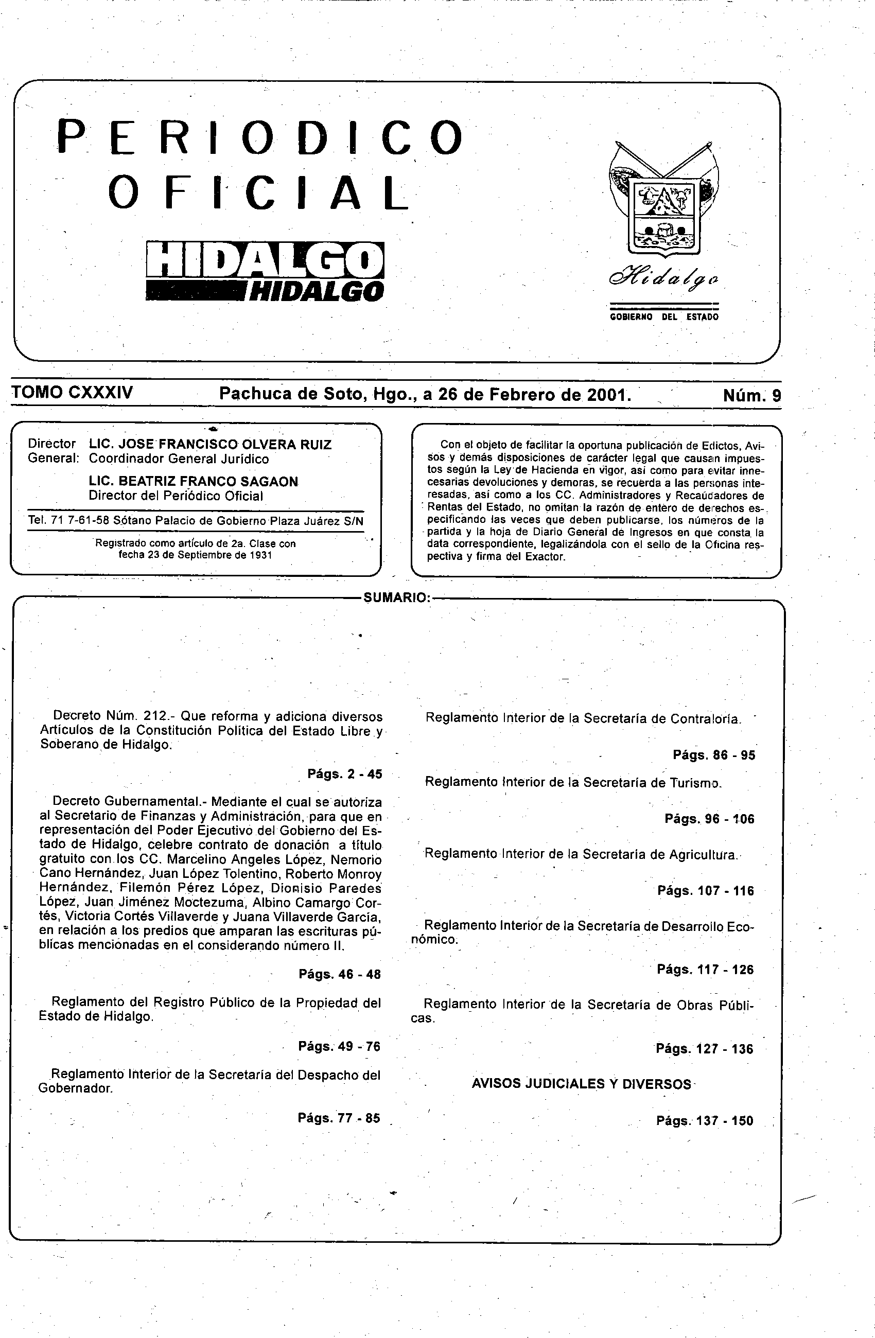 Periódico Oficial Ordinario 0 del 26 de febrero de 2001
