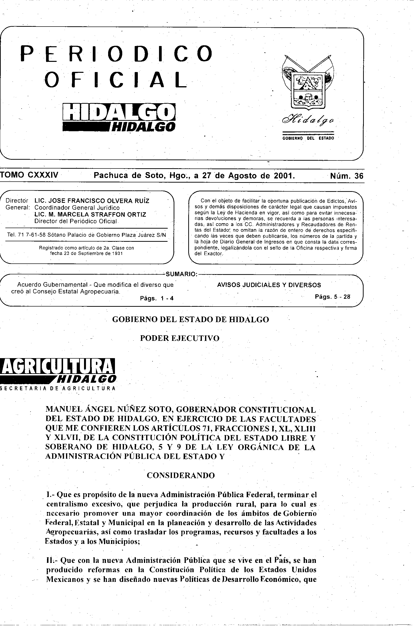 Descargar Periódico Oficial Ordinario 0 del 27 de agosto de 2001