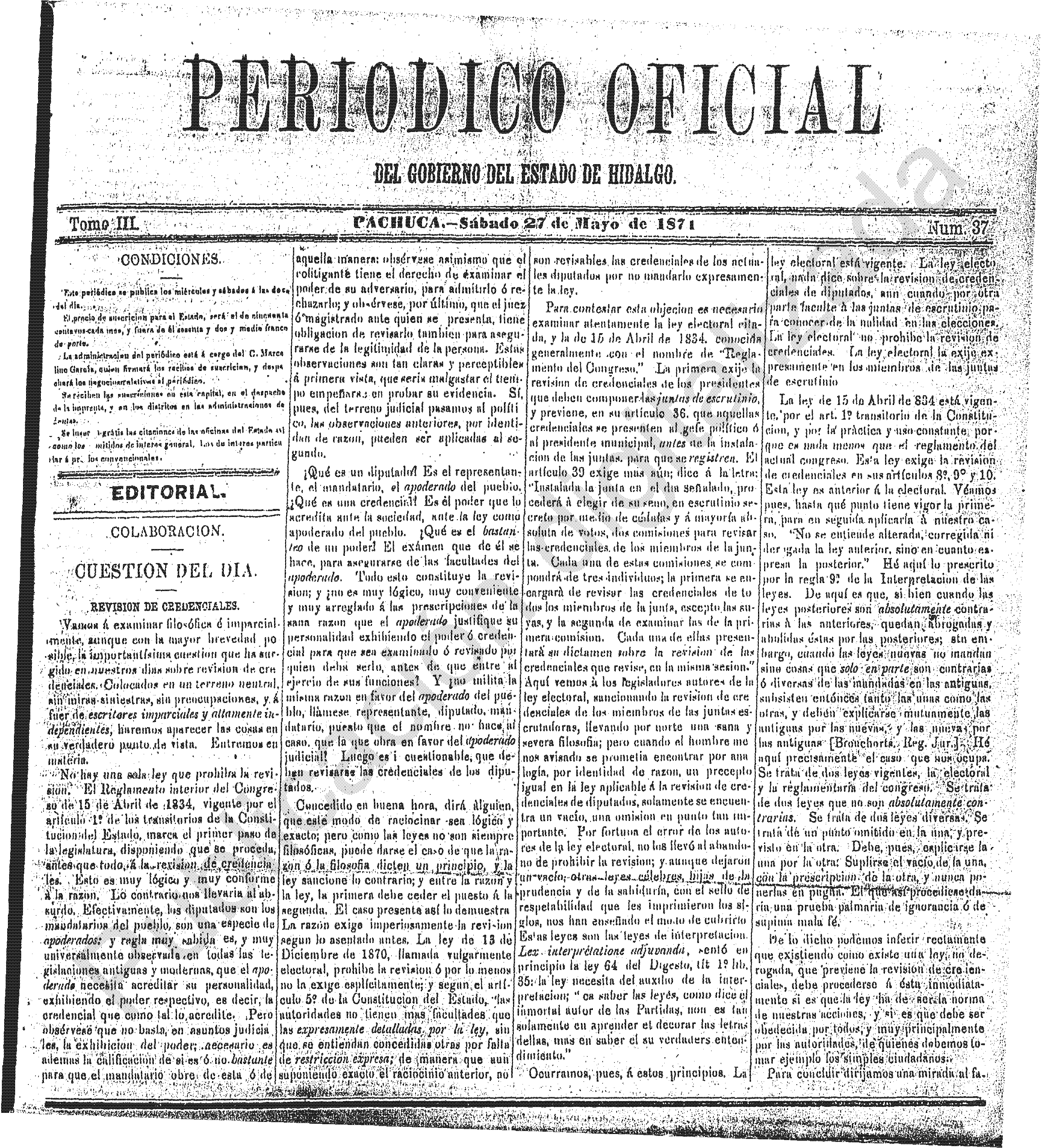 Descargar Periódico Oficial Ordinario 0 del 27 de mayo de 1871El portal web del Periódico Oficial del Estado de hidalgo es el único medio de difusión oficial del Gobierno del Estado de Hidalgo