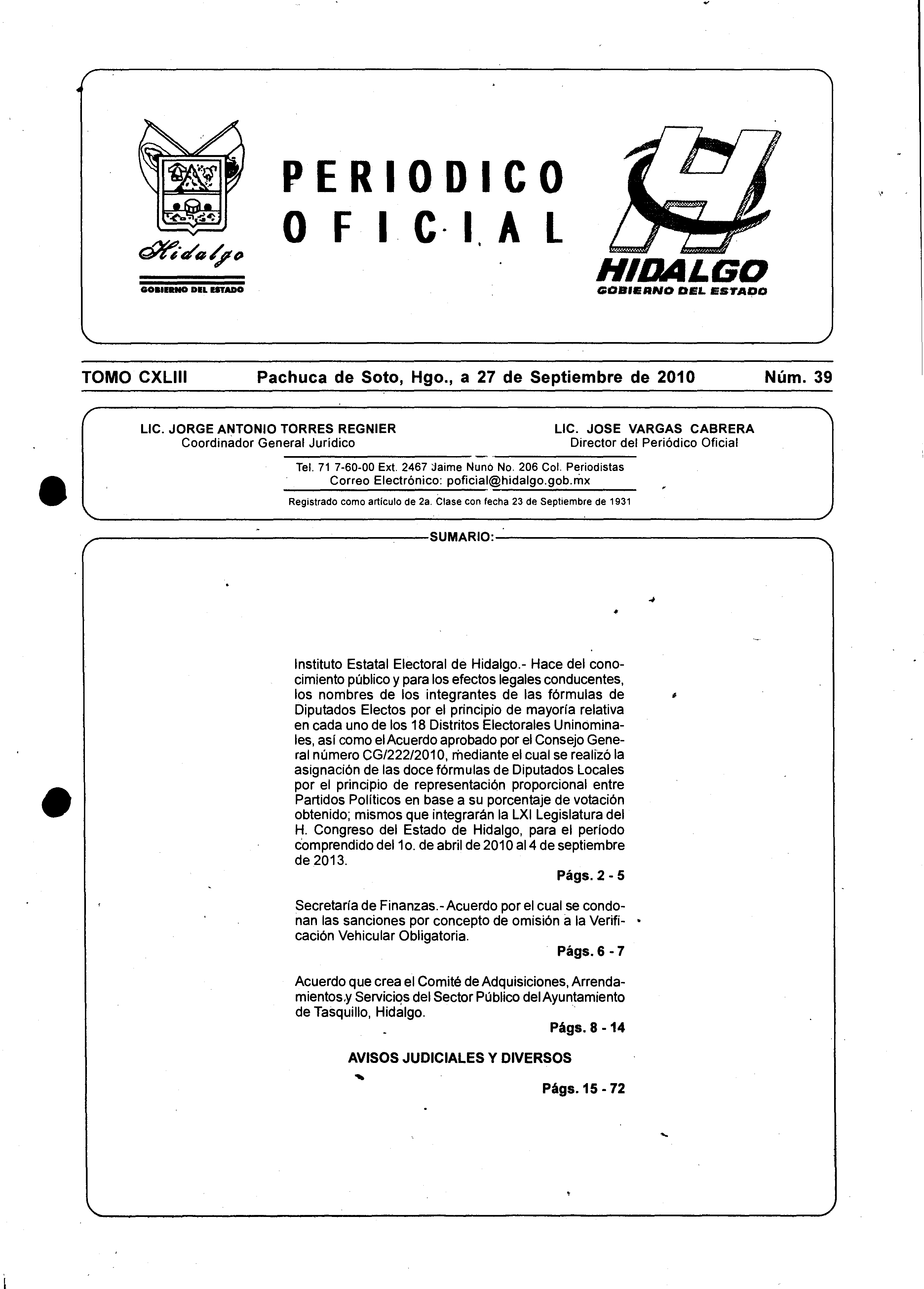 • Instituto Estatal Electoral de Hidalgo.- Hace del conocimiento público y para los efectos legales conducentes, los nombres de los integrantes de las fórmulas de Diputados Electos por el principio de mayoría relativa en cada uno de los 18 Distritos Electorales Uninominales, así como el Acuerdo aprobado por el Consejo General número CG/222/2010, mediante el cual se realizó la asignación de las doce fórmulas de Diputados Locales por el principio de representación proporcional entre Partidos Políticos en base a su porcentaje de votación obtenido; mismos que integrarán la LXI Legislatura del H. Congreso del Estado de Hidalgo, para el período comprendido del 1º de abril de 2010 al 4 de Septiembre de 2013.