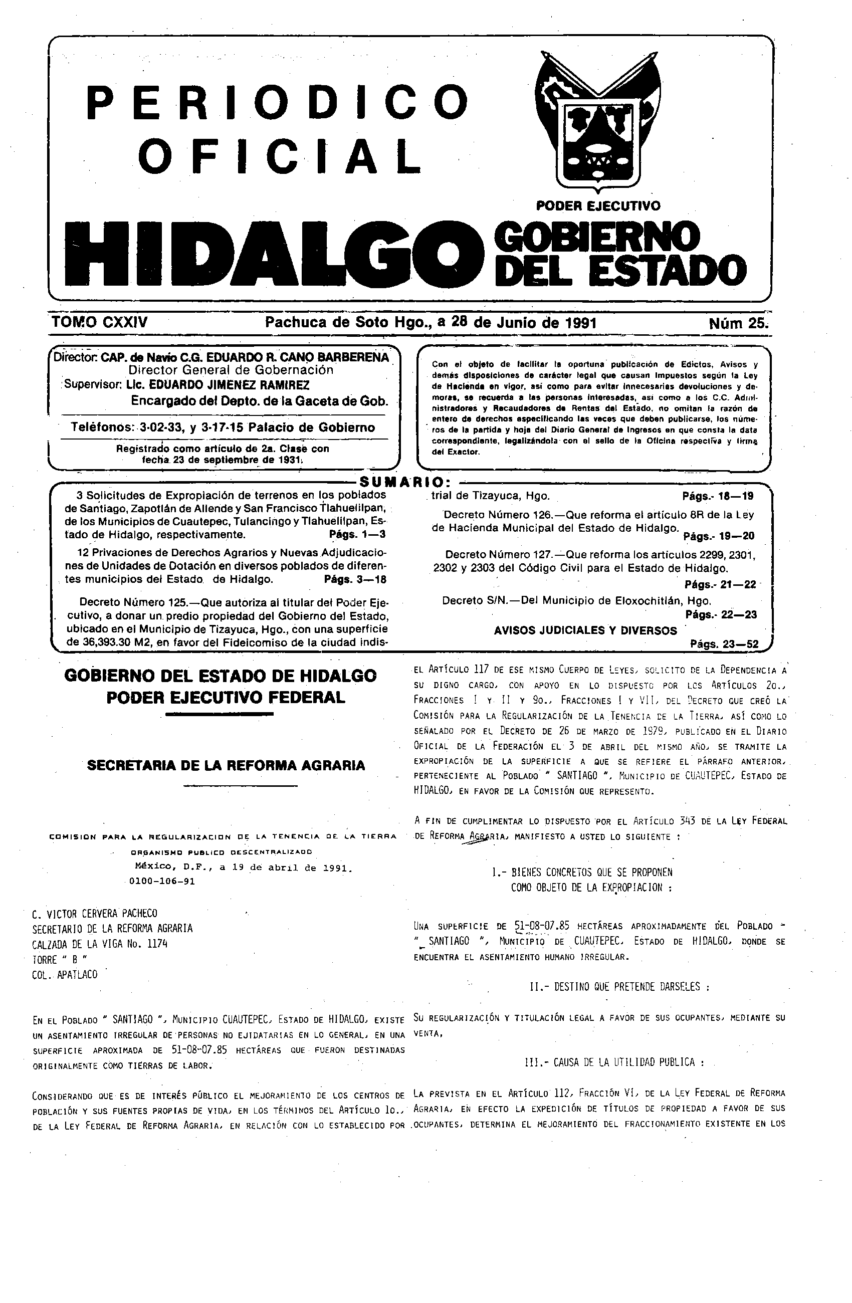 • 3 Solicitudes de Expropiación de terrenos en los poblados de Santiago, Zapotlán, de allende y san Francisco Tlahuelilpan, de los Municipios de Cuautepec, Tulancingo y Tlahuelilpan, Estado de Hidalgo, respectivamente.