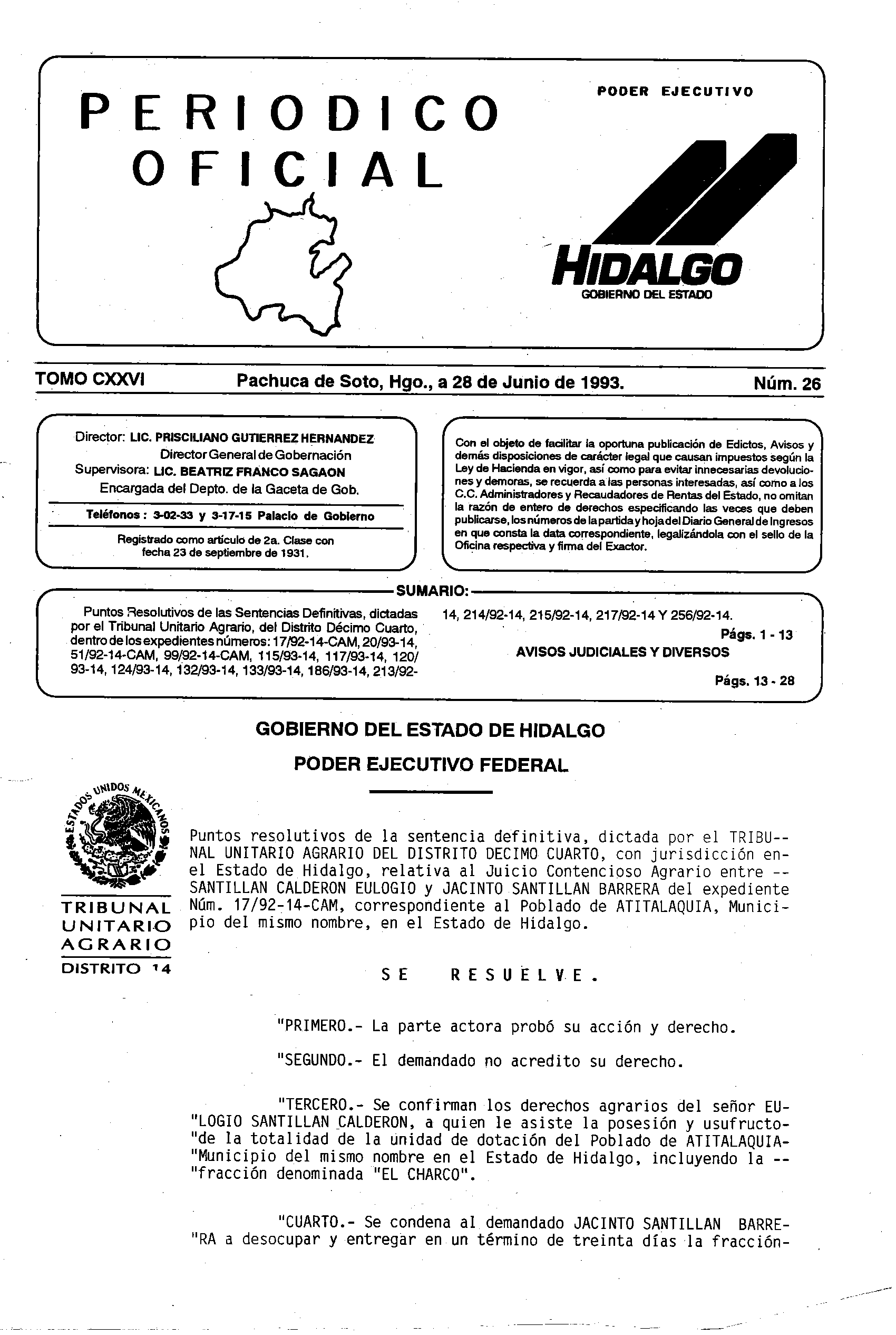 - Puntos Resolutivos de las Sentencias Definitivas, dictadas por el Tribunal Unitario Agrario, del Distrito Décimo Cuarto, dentro de los expedientes números: 17/92-14-CAM, 20/93-14, 51/92-14-CAM, 99/92-14-CAM, 115/93-14, 117/93-14, 120.