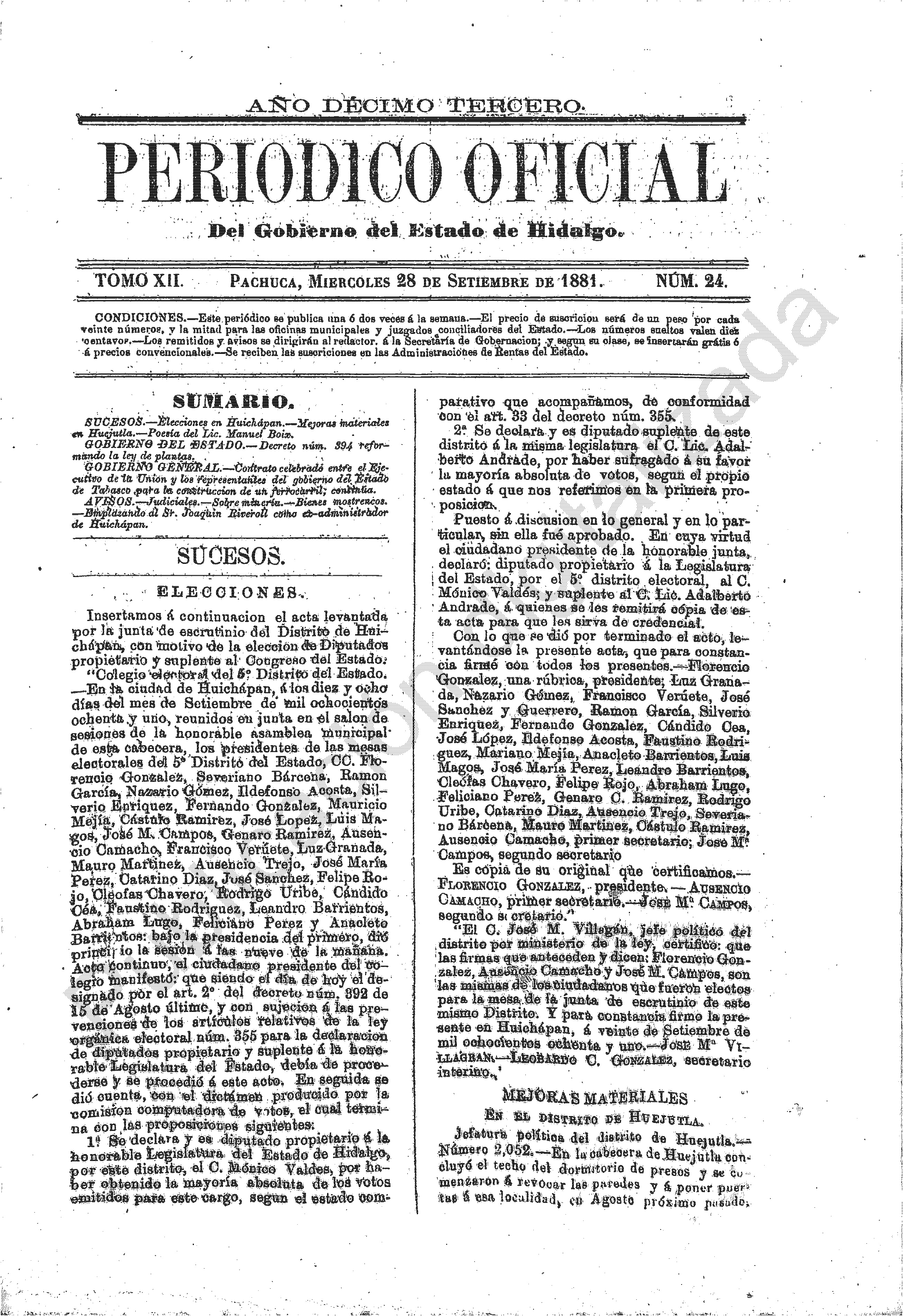 Descargar Periódico Oficial Ordinario 0 del 28 de septiembre de 1881El portal web del Periódico Oficial del Estado de hidalgo es el único medio de difusión oficial del Gobierno del Estado de Hidalgo