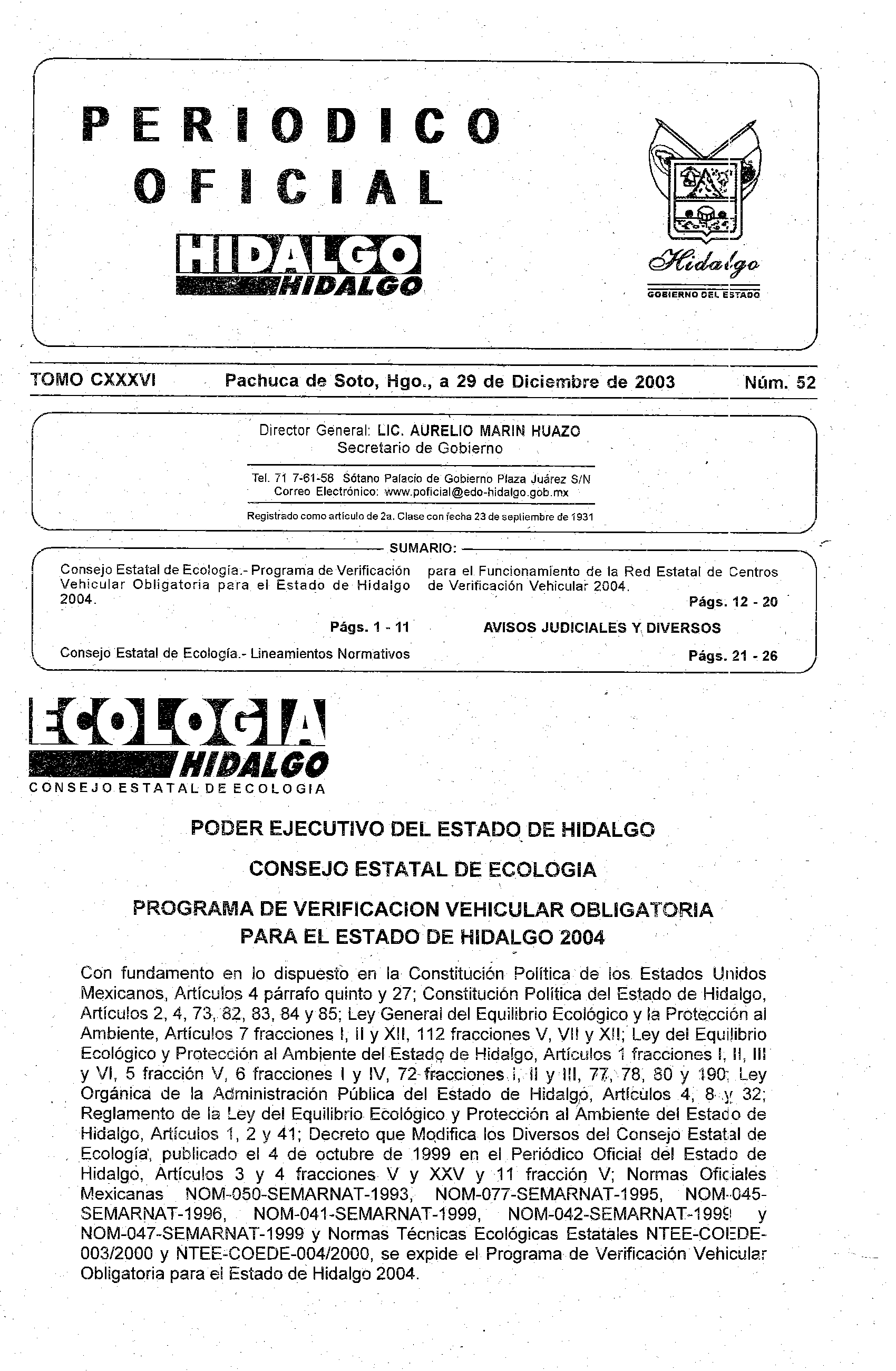 Periódico Oficial Ordinario 0 del 29 de diciembre de 2003
