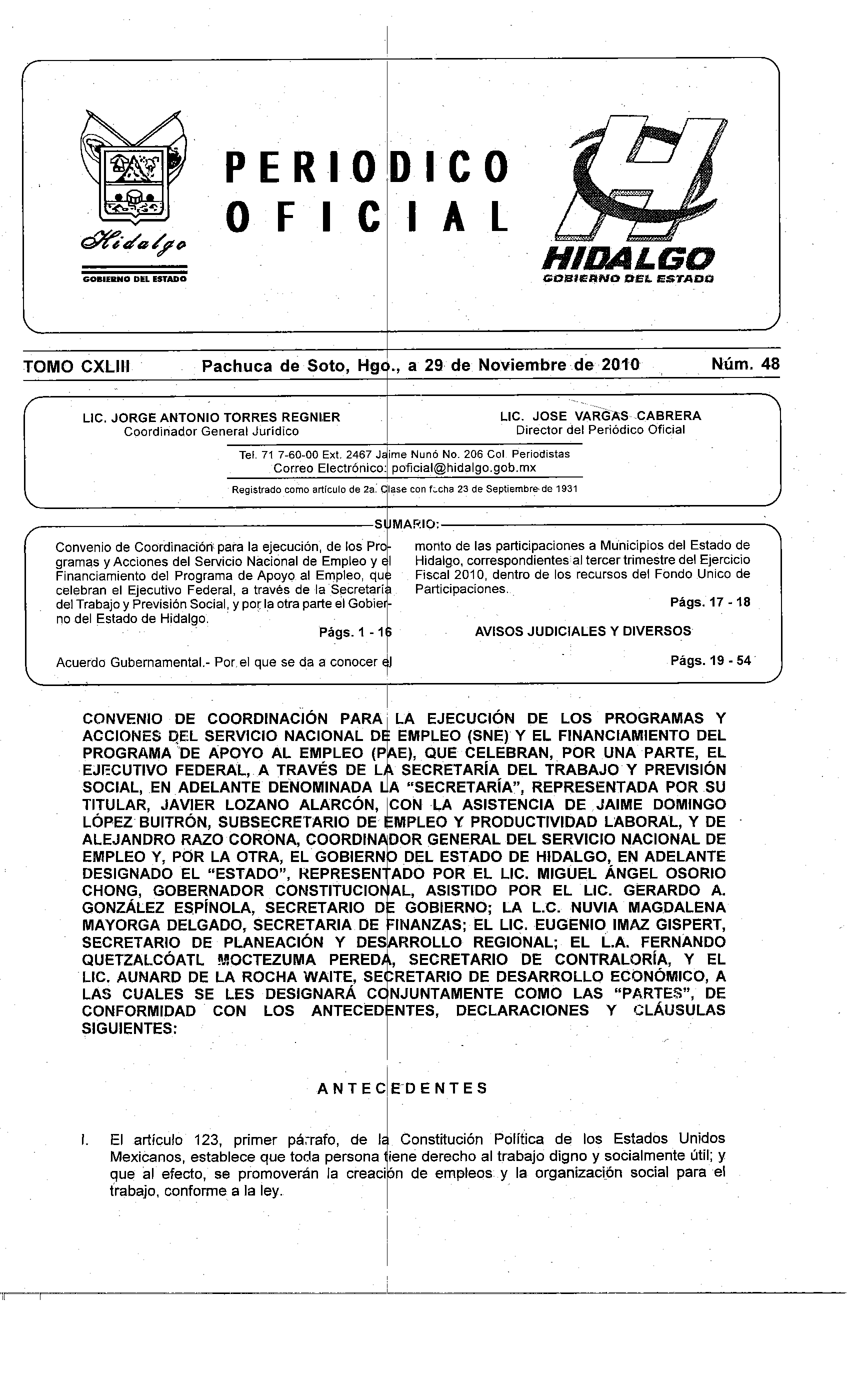 - Convenio de Coordinación para la ejecución, de los Programas y Acciones del Servicio Nacional de Empleo y el Financiamiento del Programa de Apoyo al Empleo, que celebran el Ejecutivo Federal, a través de la Secretaría del Trabajo y Previsión Social, y por la otra parte el Gobierno del Estado de Hidalgo.