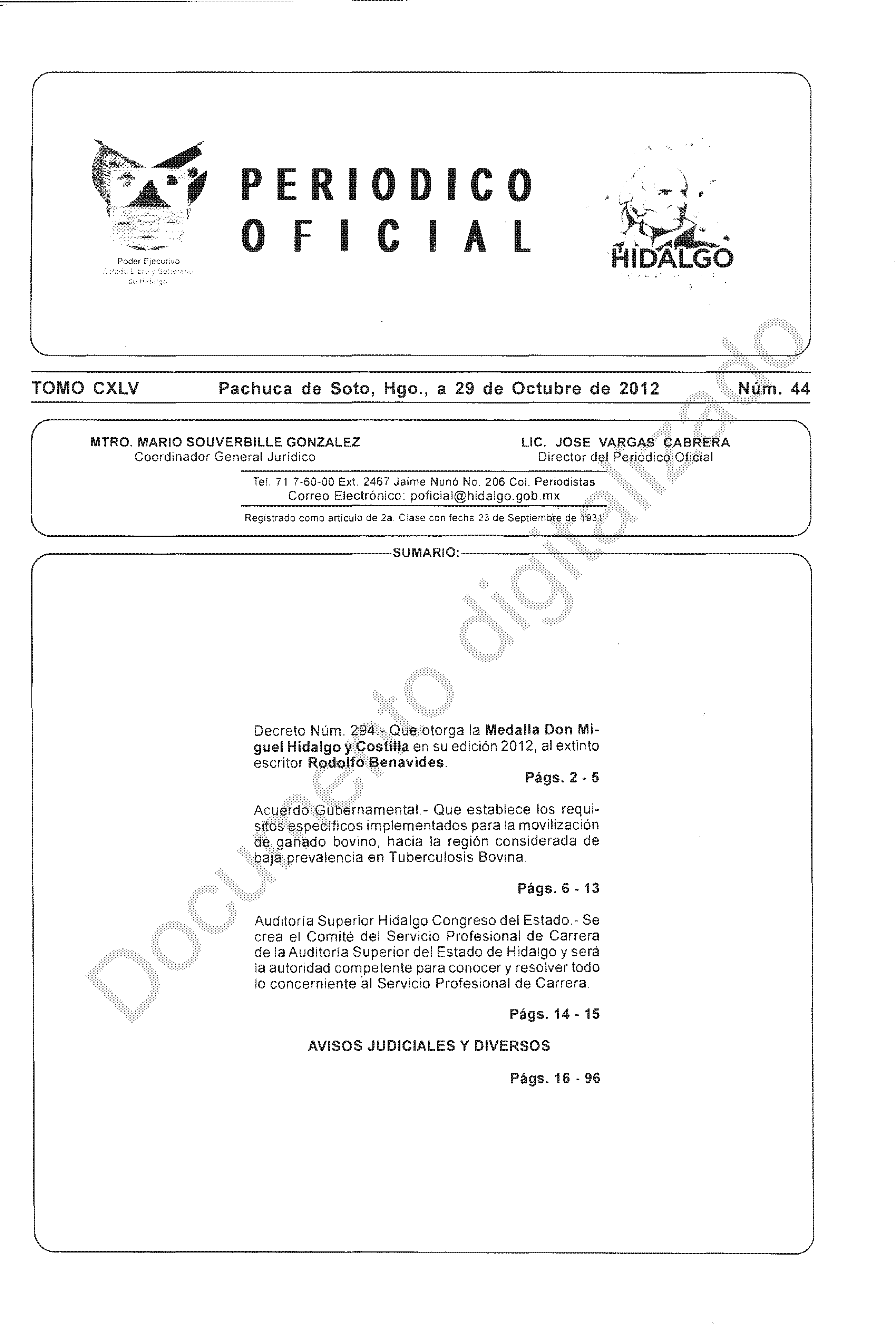 Periódico Oficial Ordinario 0 del 29 de octubre de 2012