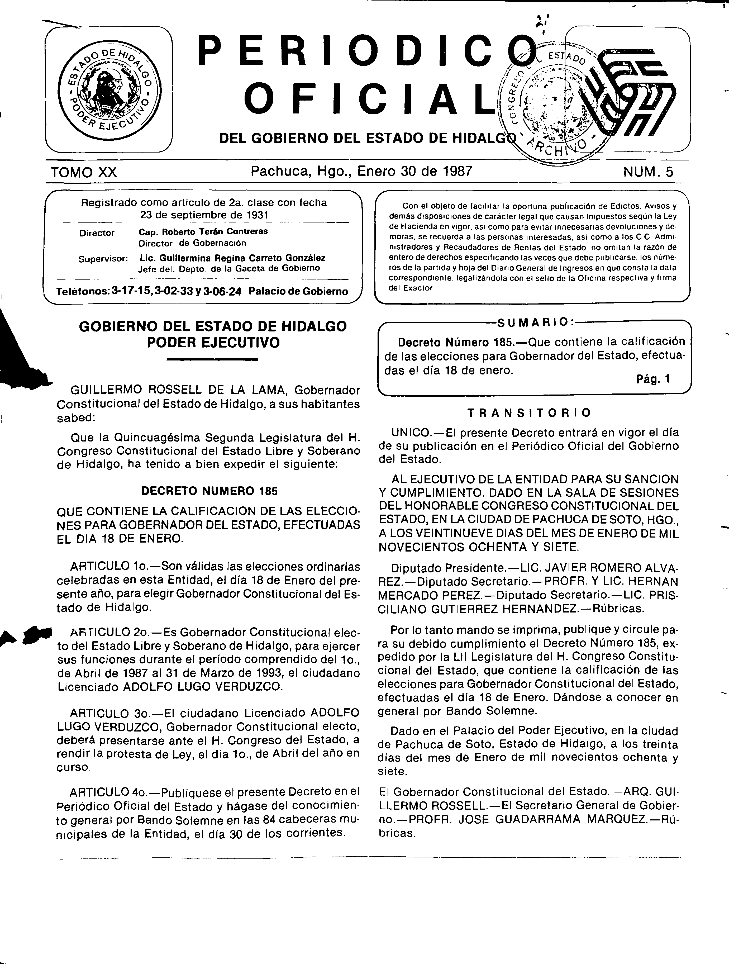 Descargar Periódico Oficial Ordinario 0 del 30 de enero de 1987