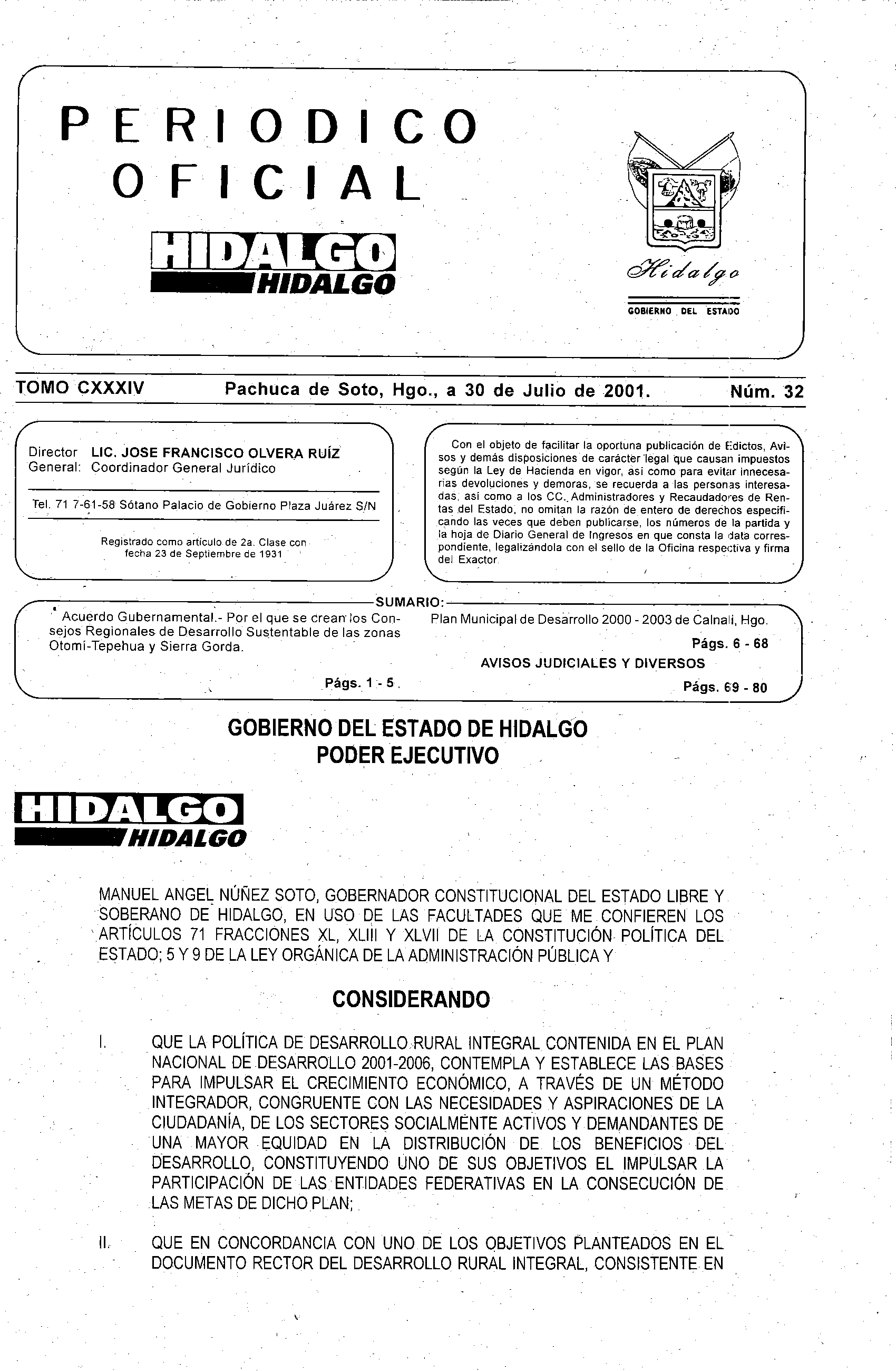 Periódico Oficial Ordinario 0 del 30 de julio de 2001