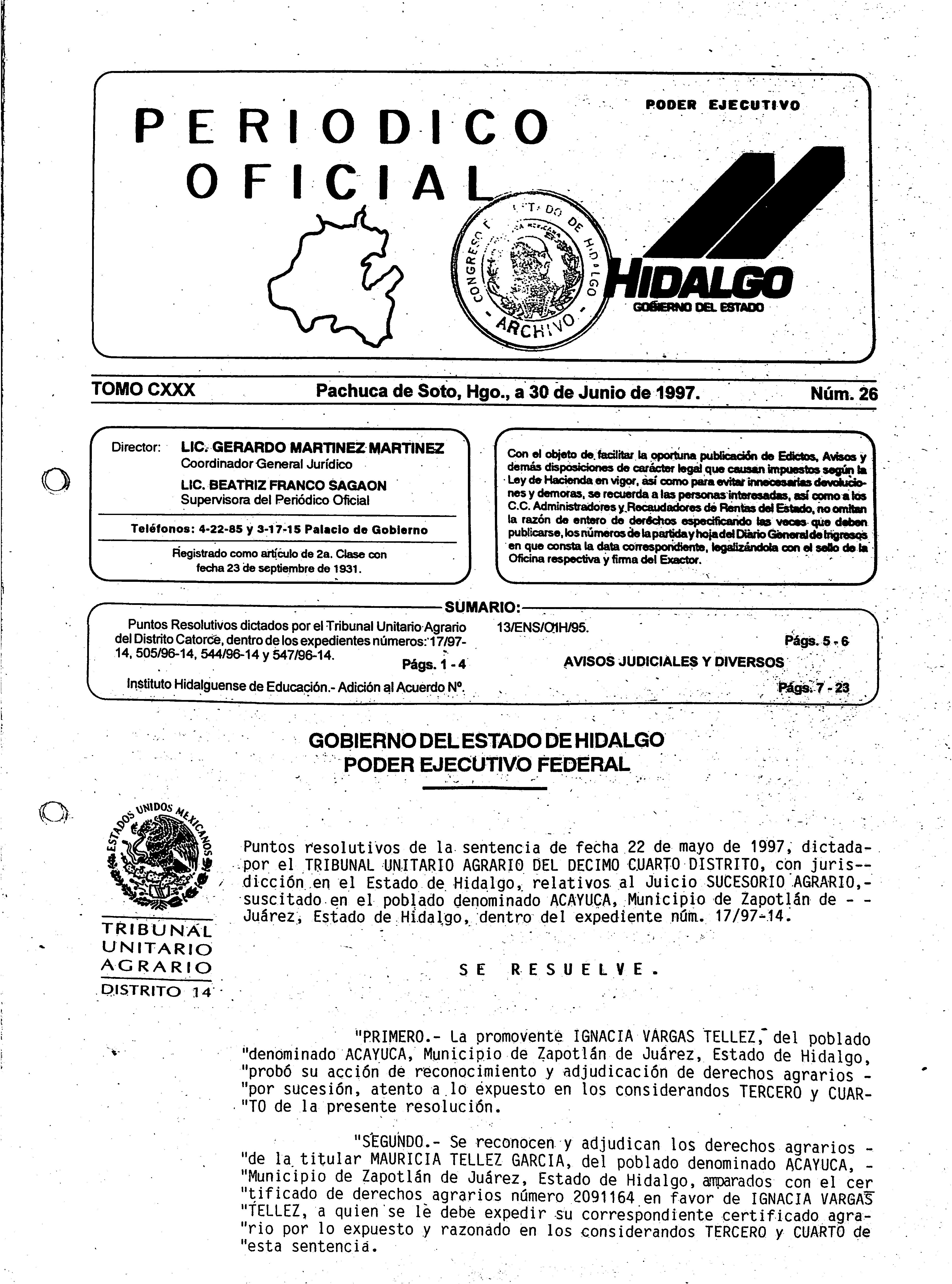• Puntos Resolutivos dictados por el Tribunal Unitario Agrario del Distrito Catorce, dentro de los expedientes número: 17/97-14, 505/96-14, 544/96-14 y 547/96-14.