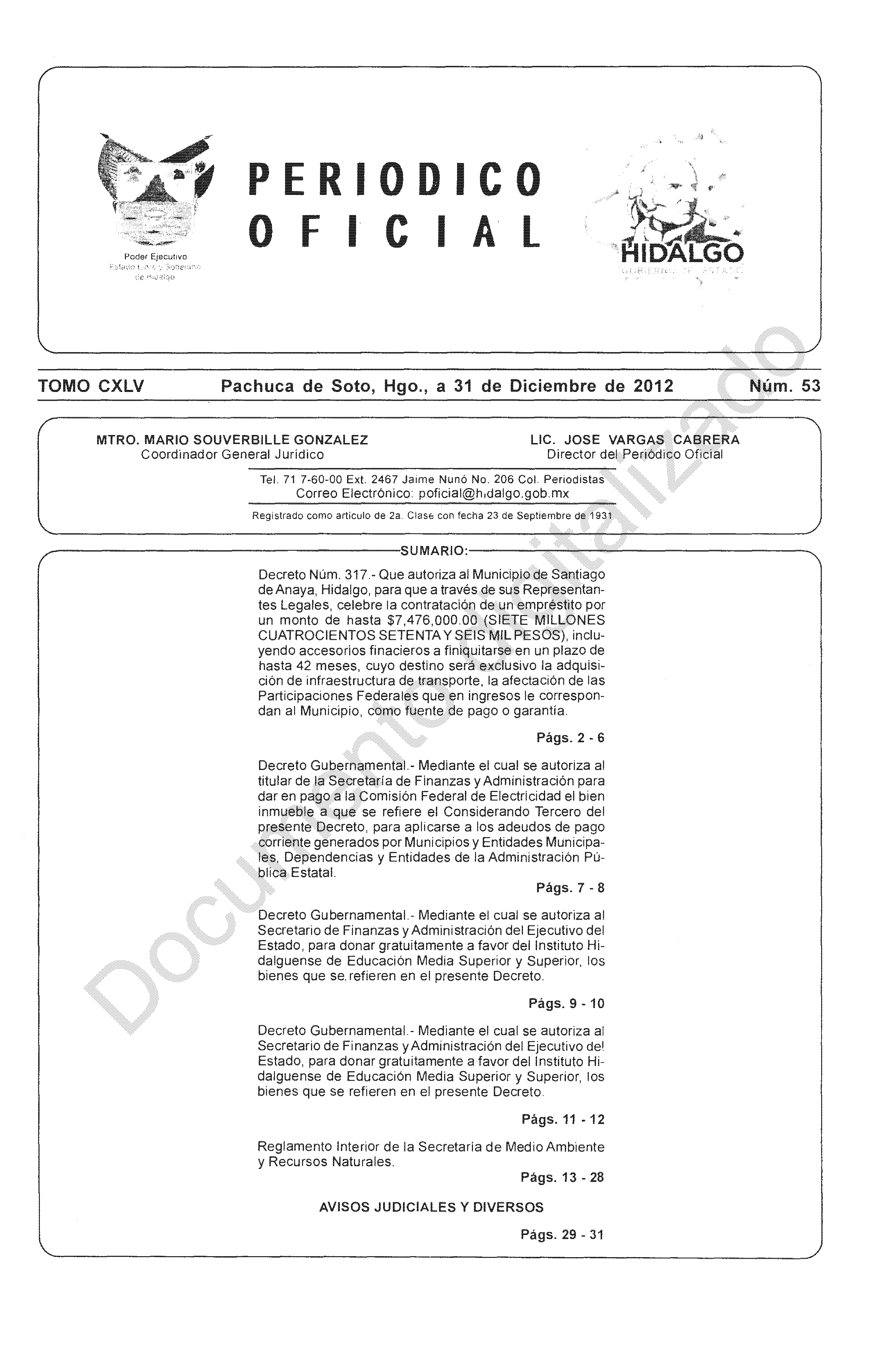 Periódico Oficial Ordinario 0 del 31 de diciembre de 2012