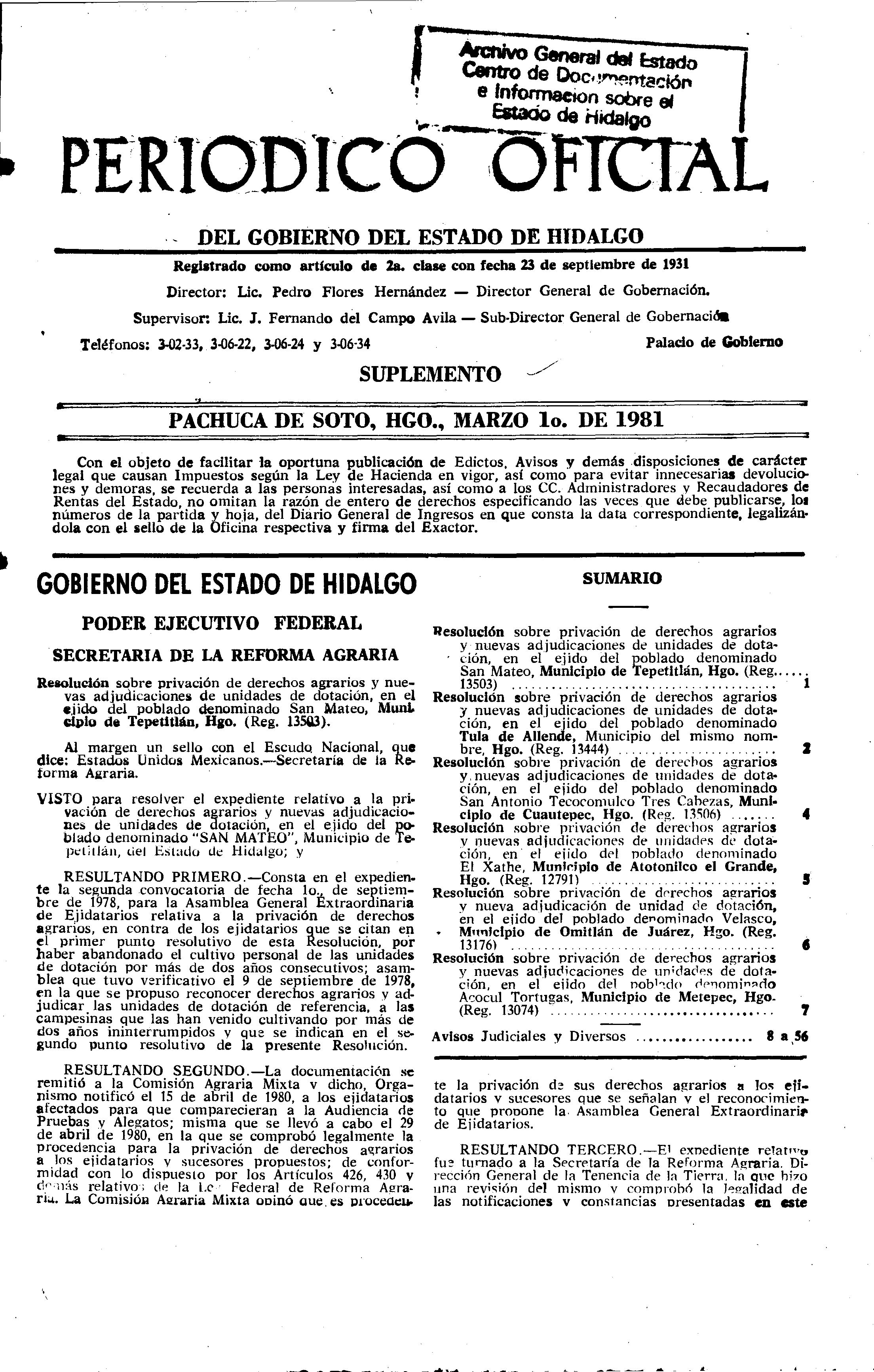 - Secretaría de la Reforma Agraria.- Resolución sobre privación de derechos agrarios y nuevas adjudicaciones de unidades de dotación, en el ejido del poblado denominado San Mateo, Municipio de Tepetitlán, Hgo.