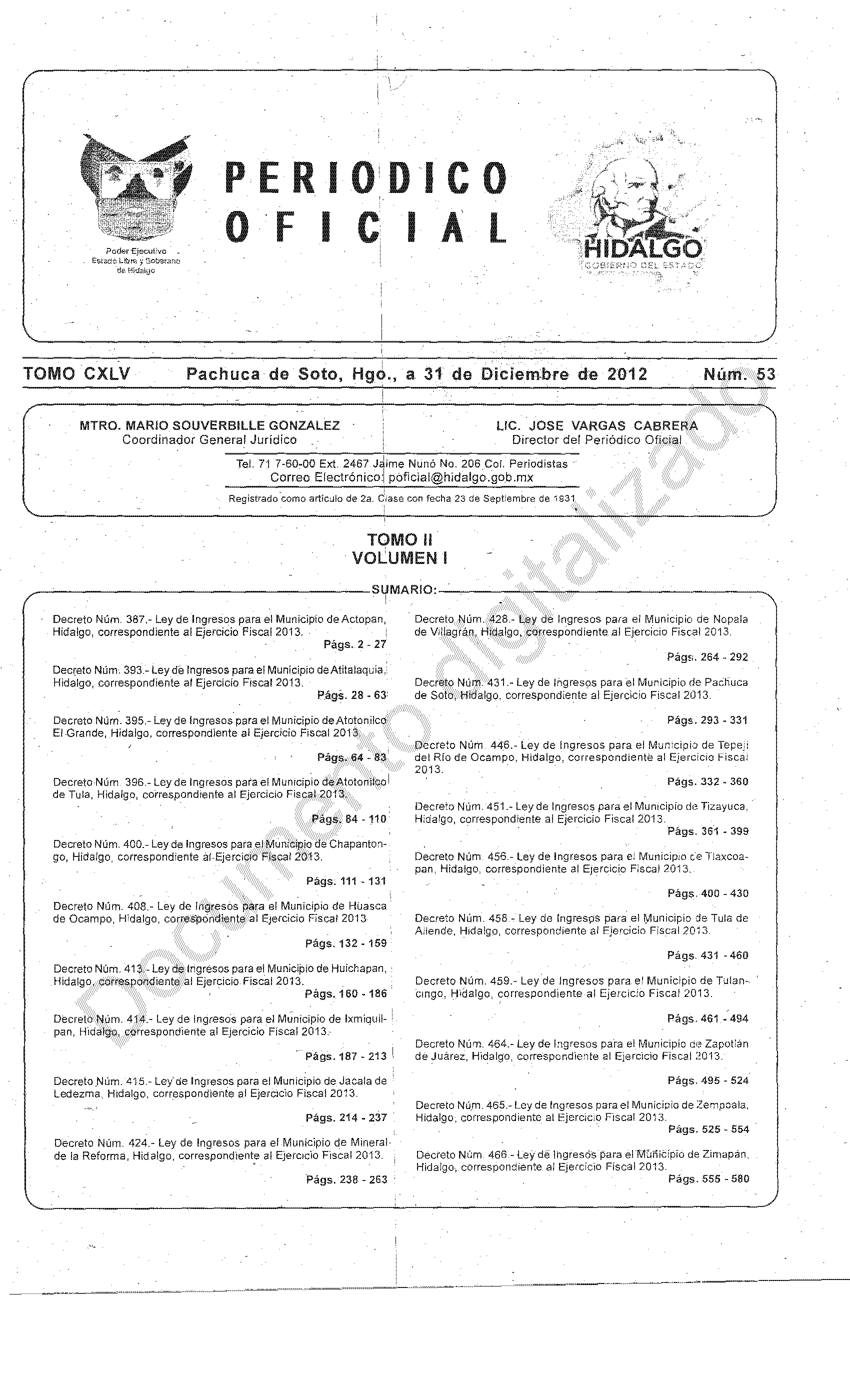 Decreto Núm. 464.- Ley de Ingresos para el Municipio de Zapotlán de Juárez, Hidalgo, correspondiente al Ejercicio Fiscal 2013.