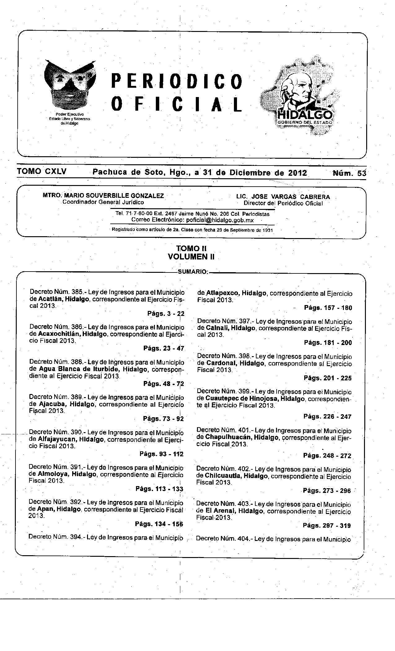 • Decreto Núm. 385.- Ley de Ingresos para el Municipio de Acatlán, Hidalgo, correspondiente al Ejercicio Fiscal 2013.