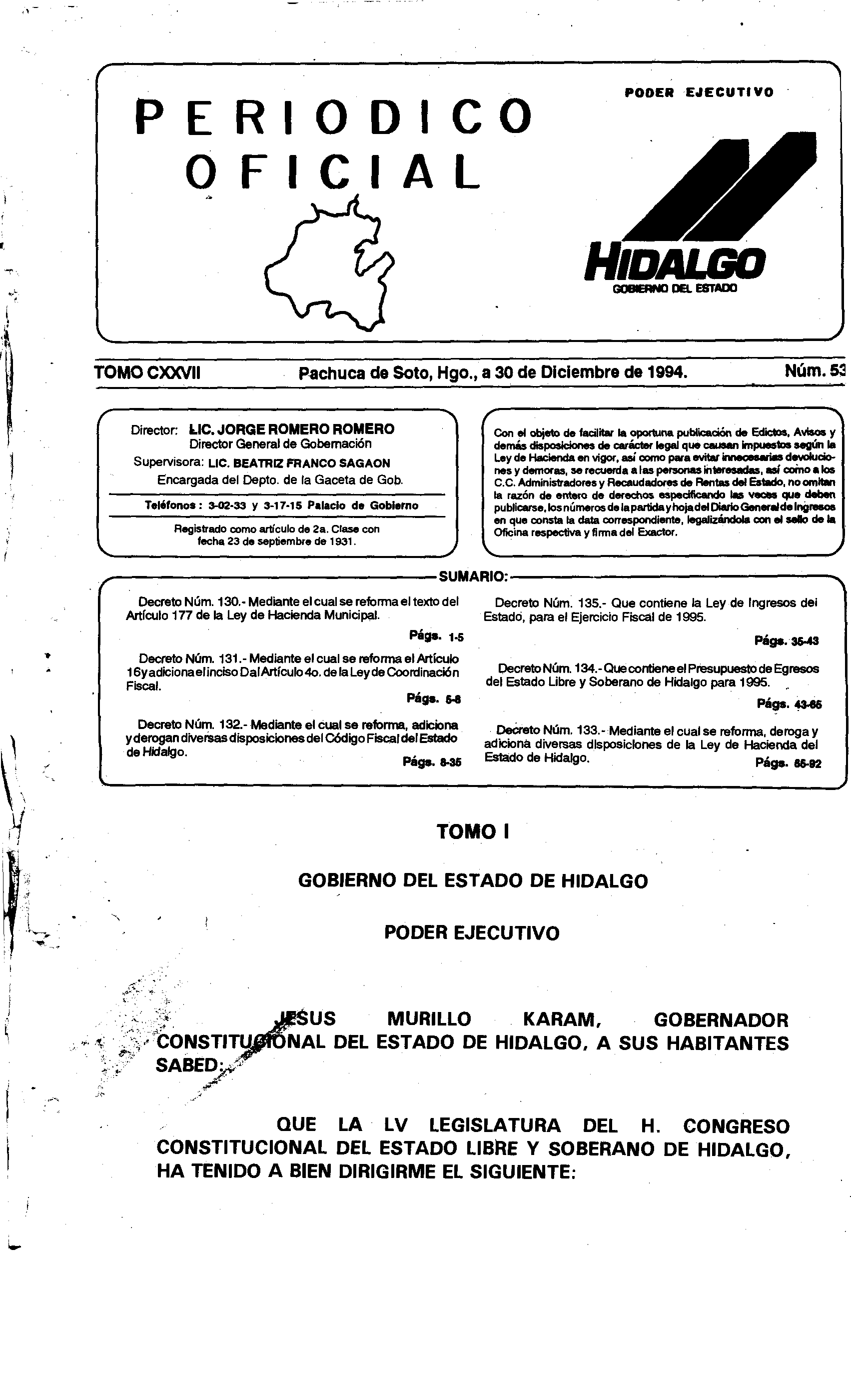 Periódico Oficial Volumen 1 del 30 de diciembre de 1994