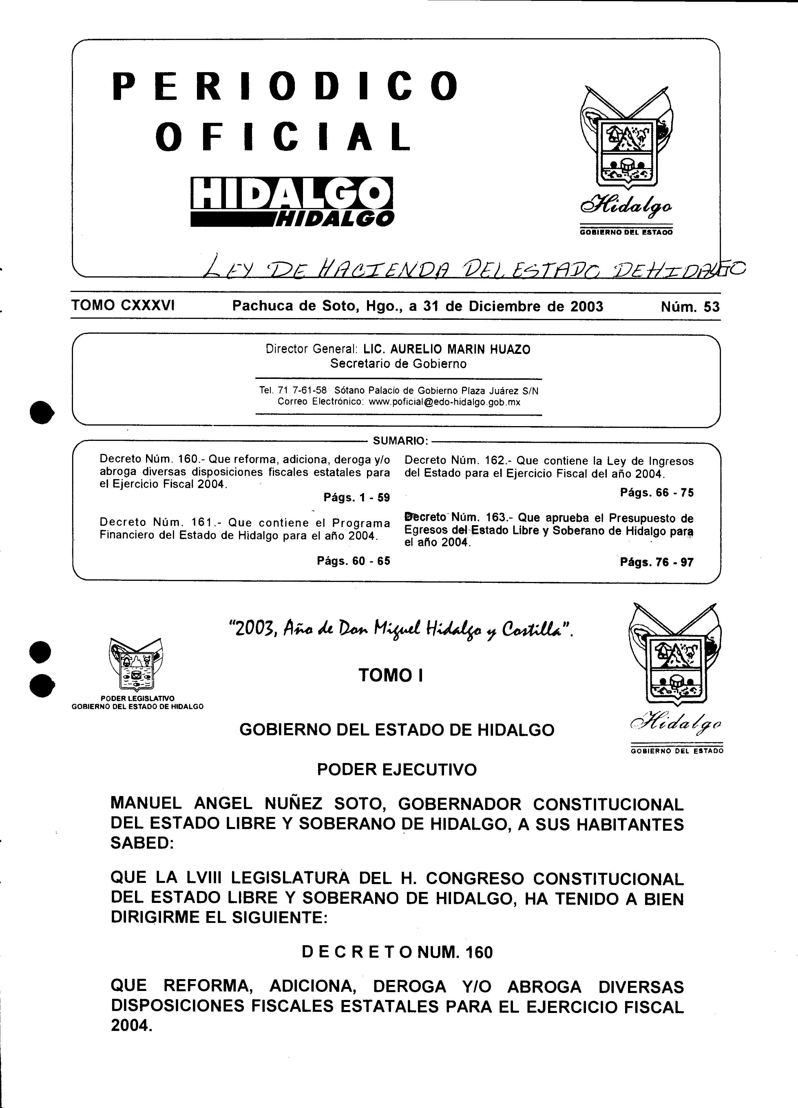 - Decreto Núm. 161.- Que contiene el Programa Financiero del Estado de Hidalgo para el año 2004.Decreto Núm. 162.- Que contiene la Ley de Ingresos del Estado para el Ejercicio Fiscal del año 2004.