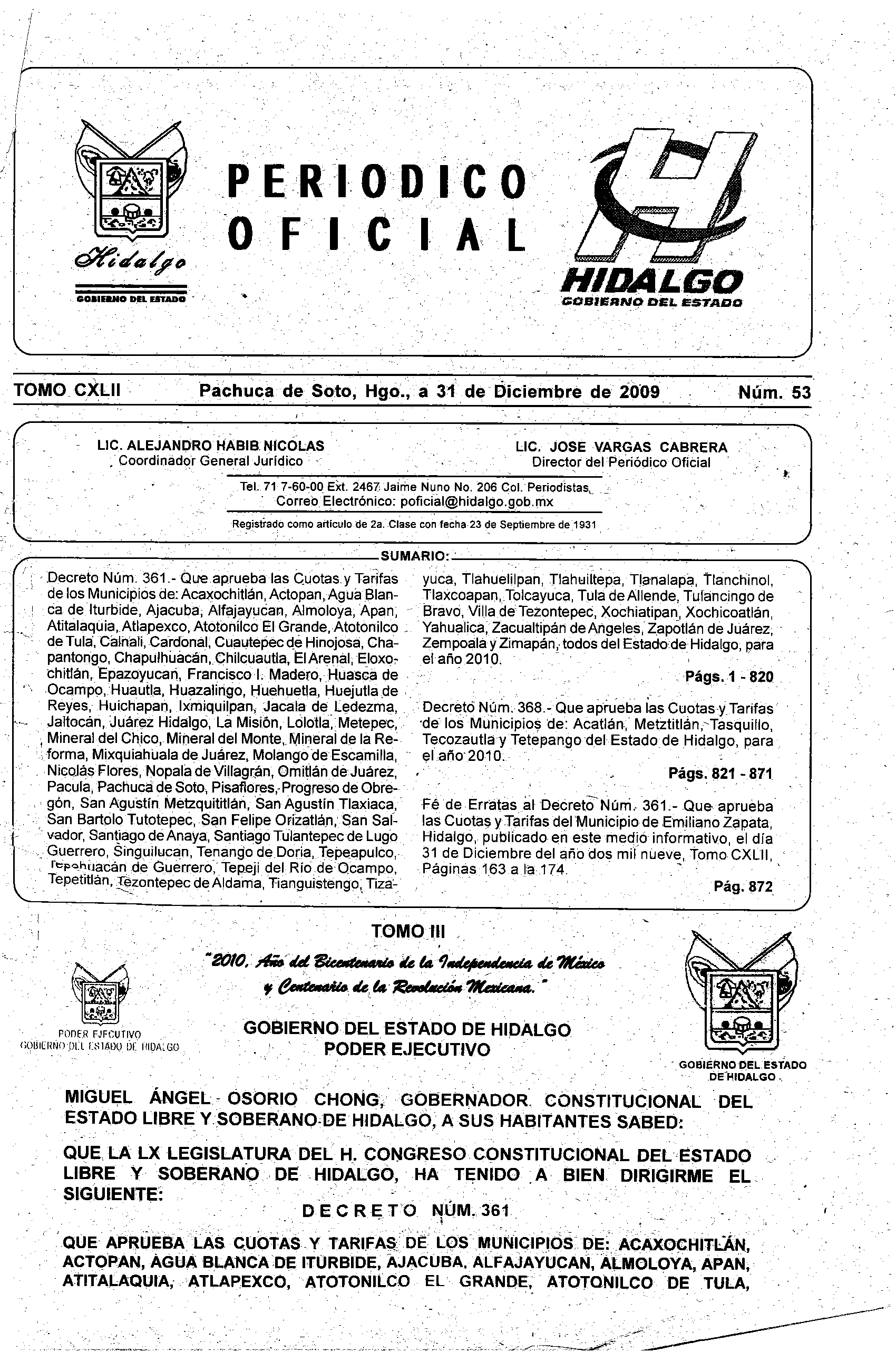 - Decreto Núm. 361.- Que aprueban las Cuotas y Tarifas de los Municipios de: Acaxochitlán, Actopan, Agua Blanca de Iturbide, Ajacuba, Alfajayucan, Almoloya, Apan, Atitalaquia, Atlapexco, Atotonilco El Grande, Atotonilco de Tula, Calnali, Cardonal, Cuautepec de Hinojosa, Chapantongo, Chapulhuacán, Chilcuautla, El Arenal, Eloxochitlán, Epazoyucan, Francisco I. Madero, Huasca de Ocampo, Huautla, Huazalingo, Huehuetla, Huejutla de Reyes, Huichapan, Ixmiquilpan, Jacala de Ledezma, Jaltocán, Juárez Hidalgo, La Misión, Lolotla, Metepec, Mineral del Chico, Mineral del Monte, Mineral de la Reforma, Mixquiahuala de Juárez, Molando de Escamilla, Nicolás Flores, Nopala de Villagrán, Omitlán de Juárez, Pacula, Pachuca de Soto, Pisaflores, Progreso de Obregón, San Agustín Metzquititlán, San Agustín Tlaxiaca, San Bartolo Tutotepec, San Felipe Orizatlán, San Salvador, Santiago de Anaya, Santiago Tulantepec de Lugo Guerrero, Singuilucan, Tenango de Doria, Tepeapulco, Tepehuacán de Guerrero, Tepeji del Río de Ocampo, Tepetitlán, Tezontepec de Aldama, Tianguistengo, Tizayuca, Tlahuelilpan, Tlahuiltepa, Tlanalapa, Tlanchinol, Tlaxcoapan, Tolcayuca, Tula de Allende, Tulancingo de Bravo, Villa de Tezontepec, Xochiatipan, Xochicoatlán, Yahualica, Zacualtipán de Angeles, Zapotlán de Juárez, Zempoala y Zimapán, todos del Estado de Hidalgo, para el año 2010.