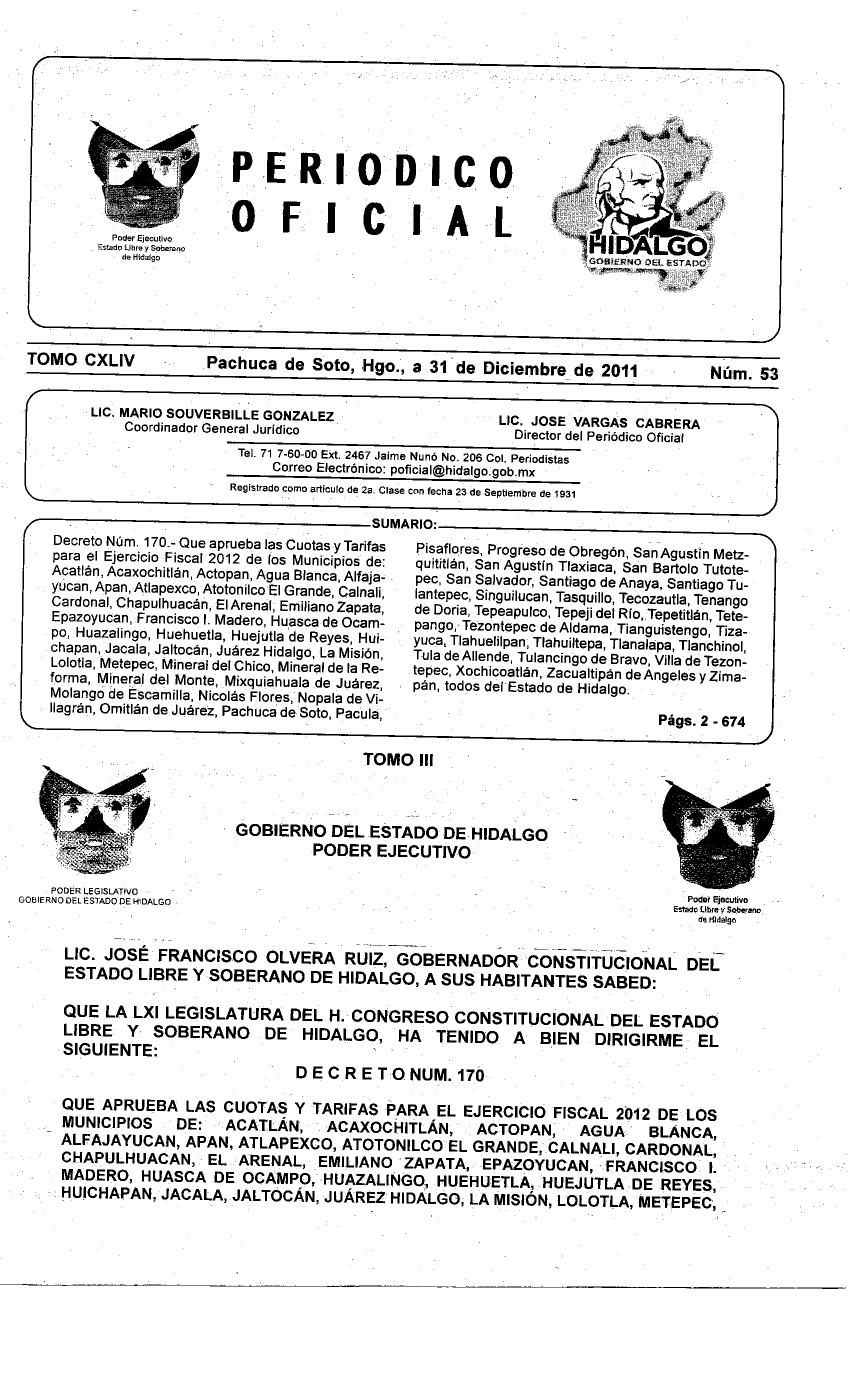 - Decreto Núm. 170.- Que aprueba las Cuotas y Tarifas para el Ejercicio Fiscal 2012 de los Municipios de: Acatlán, Acaxochitlán, Actopan, Agua Blanca, Alfajayudan, Apan, Atlapexco, Atotonilco El Grande, Calnali, Cardonal, Chapulhuacán, El Arenal, Emiliano Zapata, Epazoyucan, Francisco I. Madero, Huasca de Ocampo, Huazalingo, Huehuetla, Huejutla de Reyes, Huichapan, Jacala, Jaltocán, Juárez Hidalgo, La Misión, Lolotla, Metepec, Mineral del Chico, Mineral de la Reforma, Mineral del Monte, Mixquiahuala de Juárez, Molango de Escamilla, Nicolás Flores, Nopala de Villagrán, Omitlán de Juárez, Pachuca de Soto, Pacula, Pisaflores, Progreso de Obregón, San Agustín Metzquititlán, San Agustín Tlaxiaca, San Bartolo Tutotepec, San Salvador, Santiago de Anaya, Santiago Tulantepec, Singuilucan, Tasquillo, Tecozautla, Tenango de Doria, Tepeapulco, Tepeji del Rio, Tepetitlán, Tetepango, Tezontepec de Aldama, Tianguistengo, Tizayuca, Tlahuiltepa, Tlanalapa, Tlanchinol, Tula de Allende, Tulancingo de Bravo, Villa de Tezontepec, Xochicoatlán, Zacualtipán de Angeles y Zimapán, todos del Estado de Hidalgo.